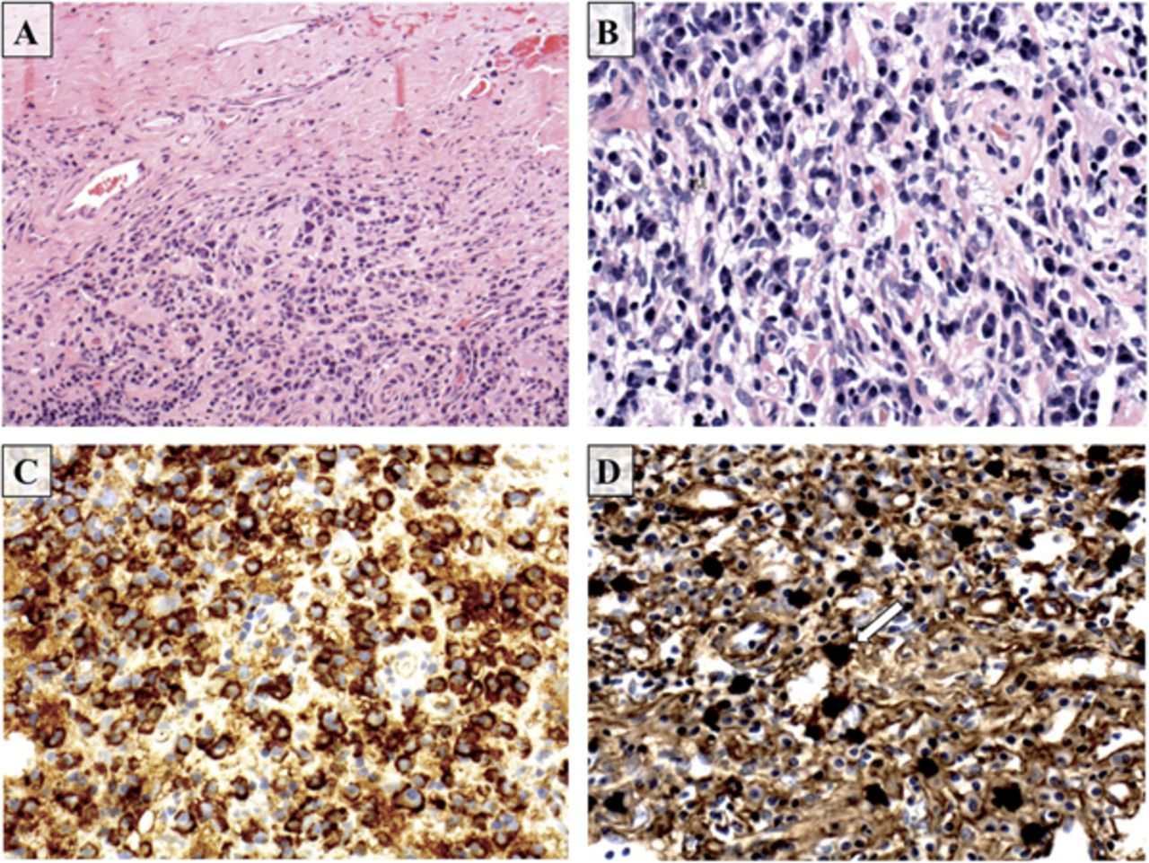 (A)部分脑膜和浆细胞浸润,苏木精和伊红())200×。(B)更强的放大显示浆细胞不典型特征,他走时400×。(C)积极的浆细胞,CD138染色,400×。(D)积极的浆细胞,免疫球蛋白G4染色(见箭头),400×。
