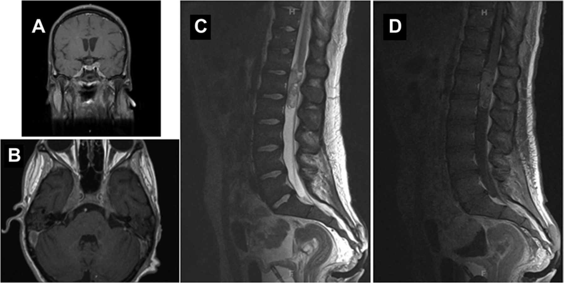 一名19岁的男子无重大病史著名3周的面部麻木和口齿不清。考试,他感觉下降在正确的中下游三叉神经分布,舌头偏差,双边面部的弱点。腰椎穿刺产生CSF与淋巴细胞主要脑脊液细胞增多(50白细胞/毫米3淋巴细胞,95%),高蛋白质(260 mg / dL),和正常的葡萄糖(49 mg / dL),没有其他证据的炎症或感染,而血清研究都是正常的。大脑MRI与钆演示了一个subcentimeter左额叶皮层下白质病变fluid-attenuated反转恢复图像和nonenhancing松果体囊肿。