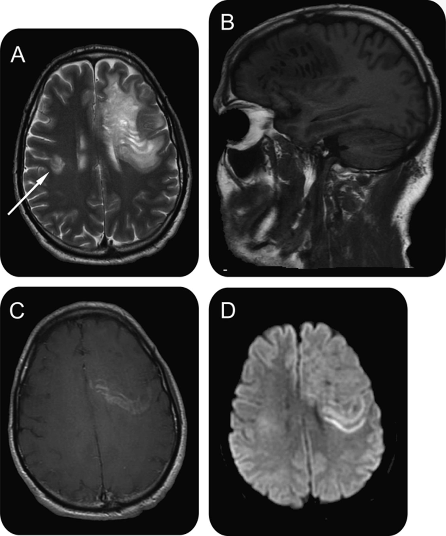(一)轴向41 t2加权图像。(B)矢状41 t1加权图像。(C)轴向gadolinium-enhanced t1加权图像。(D)轴向diffusion-weighted形象。大左额叶白质病变显示多个T2-hyperintense和T1-hypointense戒指。钆增强和扩散限制出现在最外层(主动)戒指。一个小病变右脑(箭头所指)所示。