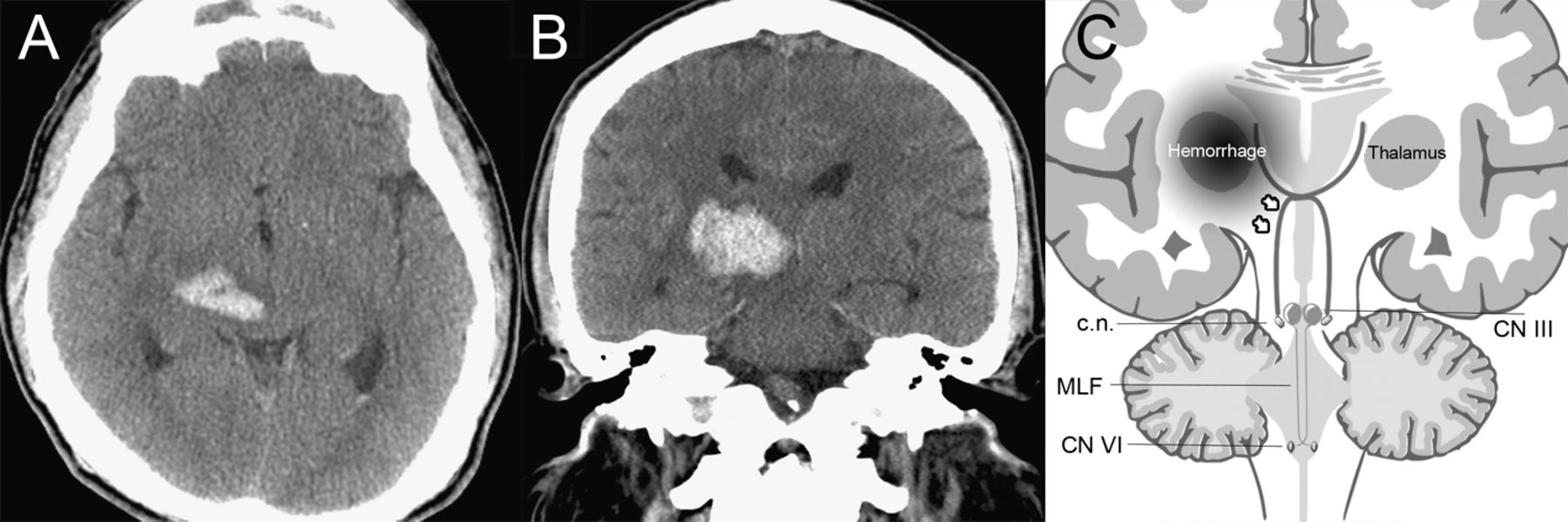 (A, B)对丘脑出血与中脑扩展和2毫米第三脑室中线的转变。(C)收敛性神经元(花旗集团(c.n:行情)眼球运动的核背外侧,由下行控制在丘脑皮层通路交叉的区域。单侧丘脑病变同侧和交叉成十字形侧纤维破坏(箭头),导致与对侧突出眼睛的双边收敛过剩。MLF =内侧纵束。