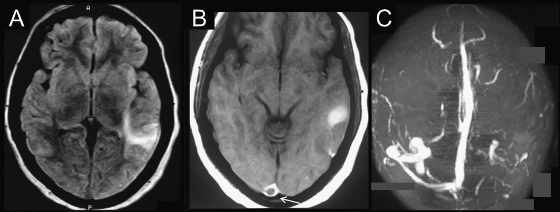 一个18岁的女人出现头痛、局部癫痫发作,左眼的视力下降20天。眼底检查发现两国视神经乳头水肿与大型premacular sub-internal限制膜和左眼subhyaloid出血(图1一个)。核磁共振大脑显示出血性梗塞的左颞叶(图2中,A和B)。磁共振造影术显示左横和乙状窦血栓形成(图2 c)。Terson综合征的诊断1(玻璃体出血)。促凝血的检查是阴性病人改善与保守的管理2(图1 b)。尽管Terson与蛛网膜下腔出血综合症报道,与皮质静脉窦血栓形成的发生是罕见的。