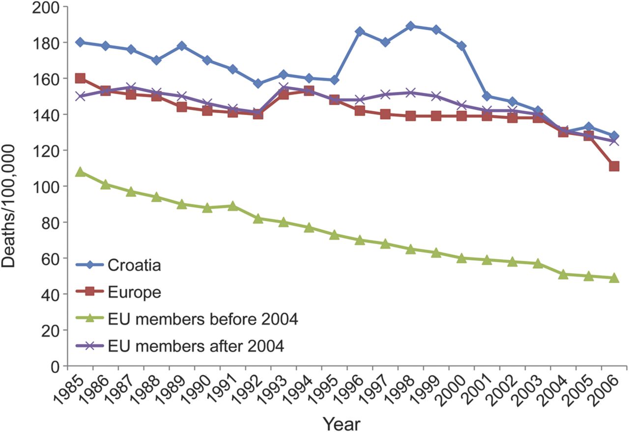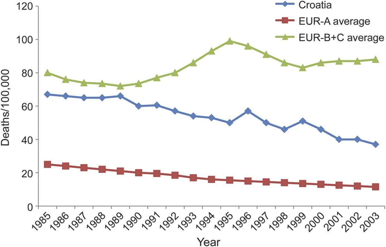 例如,中风的发病率在克罗地亚太高比其他欧盟国家;中风是第二死因和永久性残疾的第一个原因图1)。中风在克罗地亚导致死亡的人数比乳腺癌、肠癌,肺癌合并,四分之一的中风影响年轻人。1死于心血管疾病的风险对克罗地亚的男性和女性两倍Eur-A平均,这种差异并没有减少。克罗地亚最大的超额死亡率,而Eur-A average-specifically中年在职的脑血管疾病(图2)。2