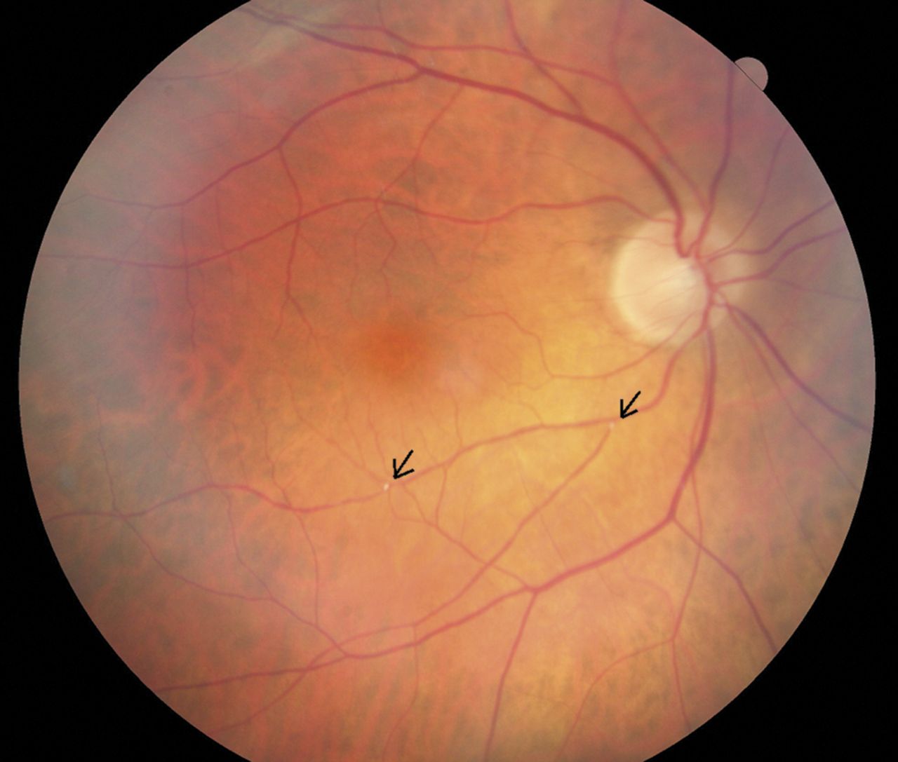 一个73岁的老人高血压和高脂血症是临床抱怨右眼的视力下降。床边检查显示右眼下侧视野缺陷由于缺血性视神经病变和2亮管腔内的黄色斑块位于两个不同的小动脉的分支,(图)。颈动脉超声检查显示一个不稳定、移动、nonocclusive溃烂斑块在正确的颈动脉分叉(见视频首页®网站www.首页neurology.org)。Hollenhorst斑块1胆固醇晶体栓子被认为起源于侧颈动脉分叉,在缺乏一时性黑蒙或狭窄,不与侧脑梗塞的风险增加有关。2