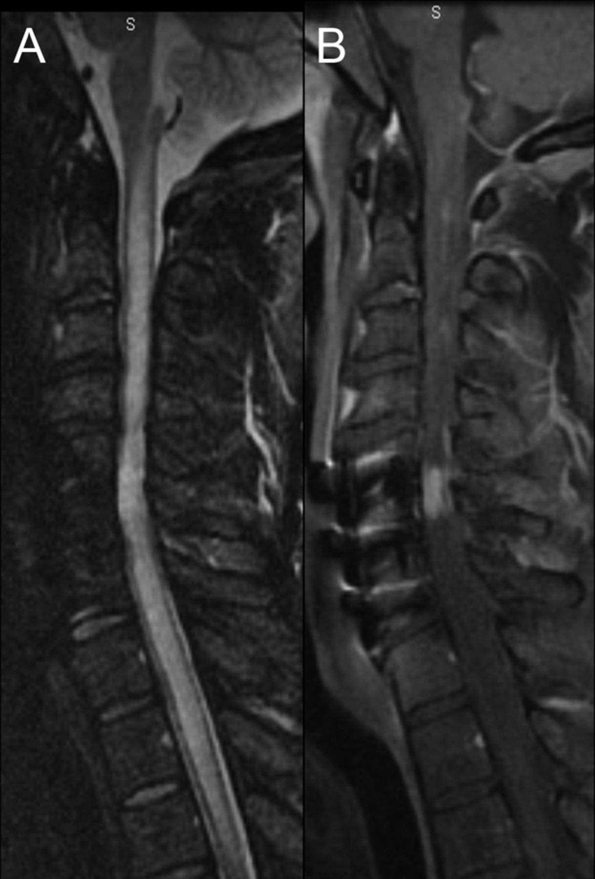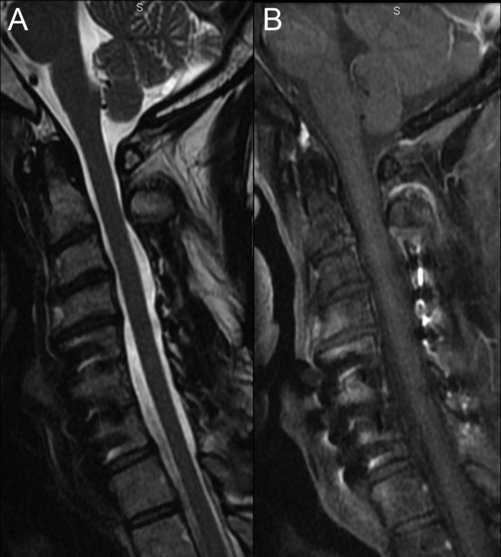 矢状t2加权图像(一)演示了支流hyperintensity从上部颈椎脊髓胸上。在postgadolinium t1加权图像(B),增强多焦点的,不完整的。
