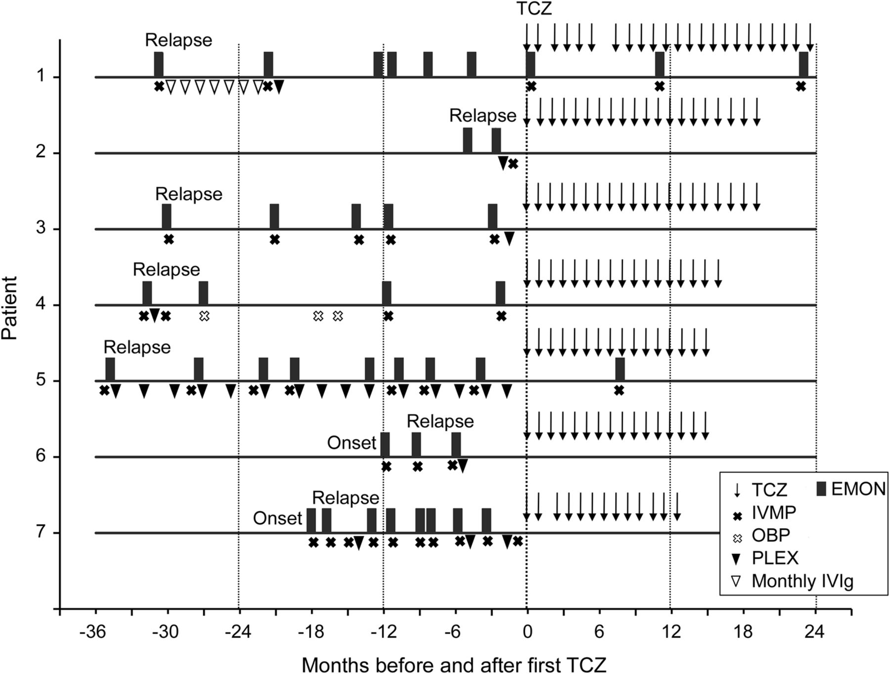 方法:七anti-aquaporin-4抗体(AQP4-Ab)阳性患者动或动谱系障碍招募他们有限的响应能力的基础上,目前的治疗。他们每月注射TCZ(8毫克/公斤)与他们当前的治疗一年。我们评估复发年率,扩大残疾状态量表评分和数值等级量表对神经性疼痛和疲劳。血清水平的测量anti-AQP4-Ab AQP4-transfected细胞。