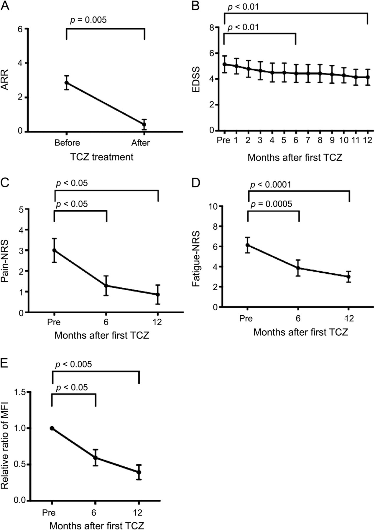 (一)年复发率(ARR)之前和之后叫(TCZ)治疗。(B)扩大残疾状态量表(eds)得分1年期研究期间。疼痛严重程度(数值评定量表(NRS)) (C)和疲劳程度(D)分数之前,后6个月和12个月后TCZ治疗的开始。点和我条指示±SEM手段。我们只分析了获得的数据在TCZ治疗的第一年。(E)的改变血清anti-aquaporin-4抗体(AQP4-Ab)进行评估的相对比例平均荧光强度(MFI),这是基于之前MFI TCZ治疗。血清anti-AQP4-Ab检测化验如前所述3,5与一些细微的修改。总之,最佳稀释血清加入人类AQP4-expressing中国仓鼠卵巢(CHO)细胞。曹cell-bound anti-AQP4-Ab检测使用荧光素isothiocyanate-anti-human免疫球蛋白G抗体流式细胞术。相比之下,每个样本的MFI除以样本的MFI TCZ治疗开始之前。