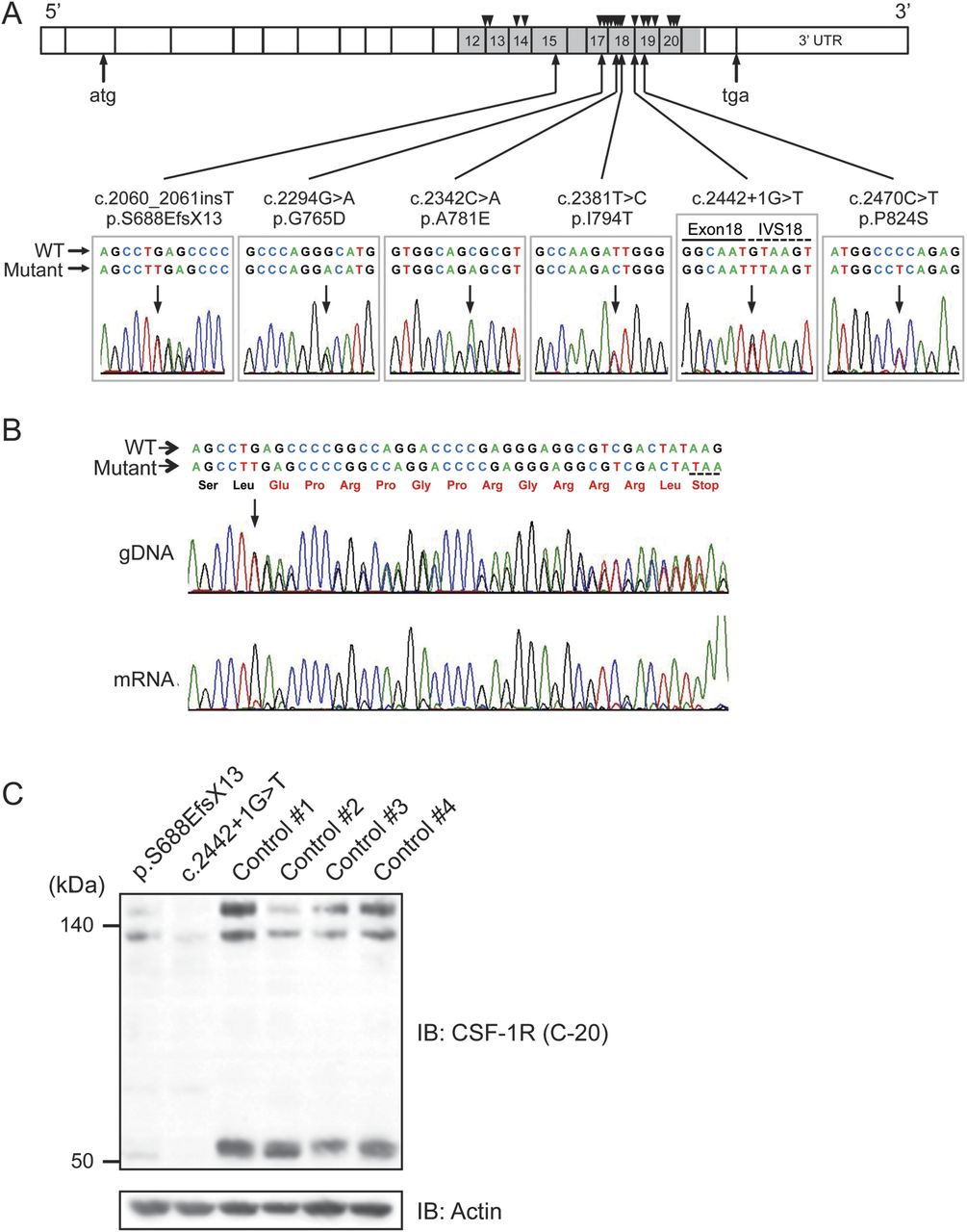 (一)原理的说明CSF-1R结构。下面显示了六种不同的突变确定在本研究中重复的图。酪氨酸激酶域的CSF-1R灰色所示。数字代表外显子的突变被确定。之前报道的突变如上三角形图所示。静脉注射=干预序列。(B)测序electropherogram放大基因组DNA和逆转录PCR扩增子的移码突变患者(p.S688EfsX13),这是预测接受nonsense-mediated mRNA衰变。突变等位基因的表达很难探测到,这表明这种移码突变导致突变mRNA的nonsense-mediated衰变。预测的氨基酸序列,后跟一个终止密码子红色所示。(C)的免疫印迹分析使用anti-CSF-1R CSF-1R蛋白抗体(C-20)特里同x - 100可溶性部分额叶皮层的解剖情况下(C。2442 + 1 g > T和p.S688EfsX13)和4(1 - 4)没有神经障碍。注意全身CSF-1R (150 kDa和130 kDa,代表成熟的蛋白质和不成熟完整的蛋白质,分别)和proteolytically裂解CSF-1R c端片段的表达水平下降明显(55 kDa)显示。蛋白质的等价荷载肌动蛋白吸干(底部)所示。