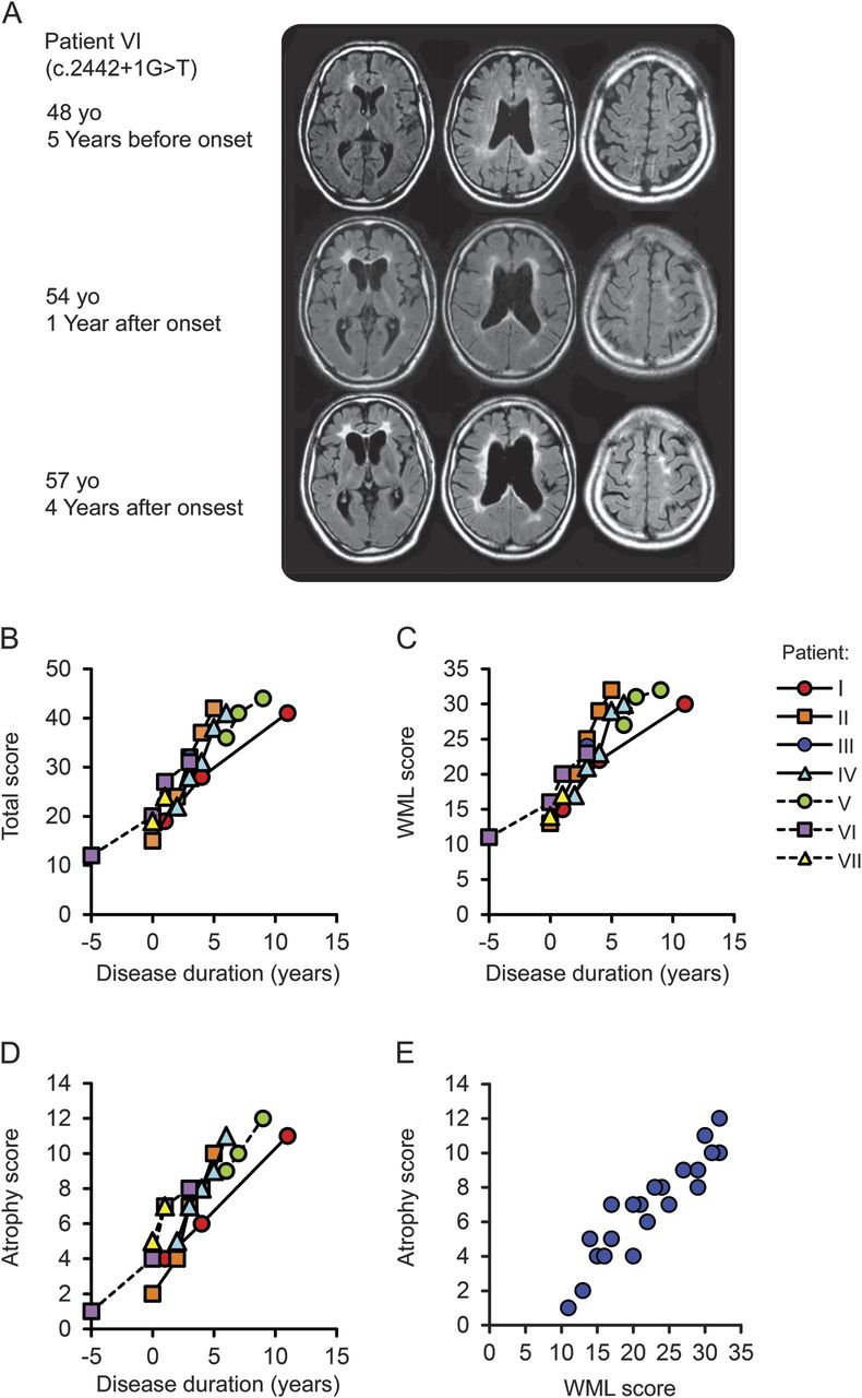 纵向MRI变化测定7 hdl患者在使用MRI评定量表。18总MRI分数范围从12至44岁的白质病变(WML)分数范围从11到32岁,和萎缩分数范围从1到12。与疾病持续时间这些MRI评分增加,每年平均分数的变化分别为3.7±1.5总分,WML得分2.5±1.1,1.3±0.5萎缩得分。有统计上显著的相关性疾病的持续时间与总(r= 0.94,p< 0.01)、WML (r= 0.94,p< 0.01)和萎缩(r= 0.92,p< 0.01)的评分(图2中,罪犯)。我们发现一个WML得分和萎缩得分显著相关性(r= 0.94,p< 0.01)(图2 e)。
