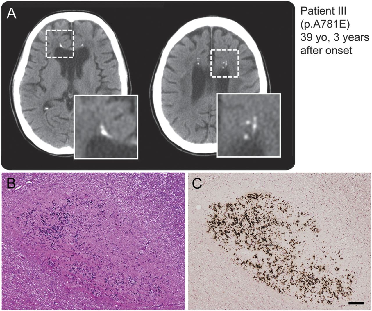 五6病人脑CT显示多个参差不齐的钙化影响白质(图3一和图e-4A)。额叶白质的钙化物质优先开发邻近侧脑室前角的。病理分析冯Kossa染色病变钙化的病人静脉显示病变包含钙沉积(图3中,B和C图的军医,罪犯)。