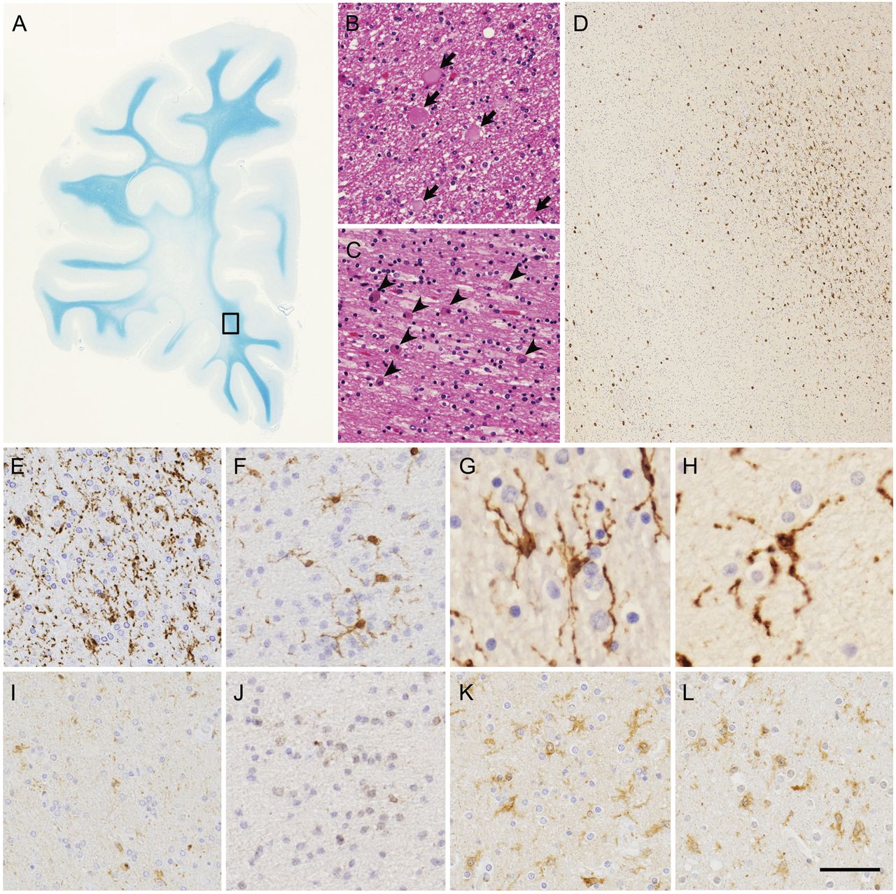 (A - c)的额叶白质病变病人VI。(A)标记的白质髓鞘损失U-fibers幸免。(B)轴突在白质(箭头)球状体。(C)丰富的巨噬细胞在白质(箭头)。(D-L)小胶质细胞在脑白质的患者遗传与球状体和控制大脑弥漫性脑白质病。(d - h)免疫组织化学Iba1退行性白质。(D, E)病人VI。(F)患者III。(G)病人IHC1。(H)病人IHC2。(D) (A)的盒装面积扩大。空间限制的Iba1-immunopositive活化的小胶质细胞(右上角)。 (E–H) Characteristic features of microglia. (I–L) CSF-1R immunohistochemistry in degenerative white matter. (I) Patient VI. (J) Patient III. (K) Patient with Alzheimer disease. (L) Patient with adrenoleukodystrophy. Images in I and J were taken from serial sections of images in E and F, respectively. Note very faint or no CSF-1R immunopositivity in activated microglia in images I and J. (A) Klüver-Barrera staining, (B, C), hematoxylin & eosin staining, (D–L) immunohistochemistry of Iba1 (D–H) and CSF-1R (I–L). Bar = 7 mm for A, 33 μm for B and C, 306 μm for D, 50 μm for E, F, and I–L, and 25 μm for G and H.