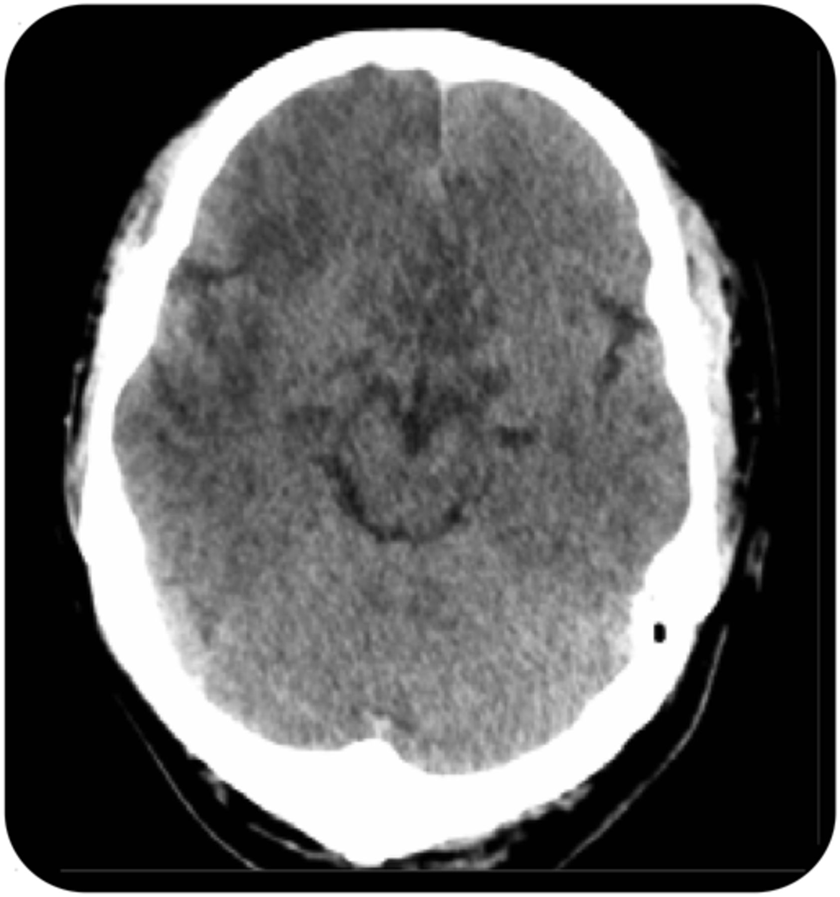 考试后,他的格拉斯哥昏迷评分分数是4/15,血压133/86毫米汞柱,体温40°C。血氧饱和度为96%对室内空气和呼吸速率19岁每分钟呼吸。神经系统检查发现颈部僵硬。病人可以睁开眼睛,虚弱地面对痛苦的刺激,疑似对上睑下垂。他的学生都是平等的直径,右相对瞳孔传入障碍。他的呕吐反射是双边。自发运动和运动反应刺激缺席。他的四肢弛缓性和深部腱反射对称。左巴宾斯基签署。心血管检查是毋庸置疑。 Blood tests revealed remarkable hyponatremia (126 mmol/L) and elevated leukocyte count (12.6 × 109/ L)。