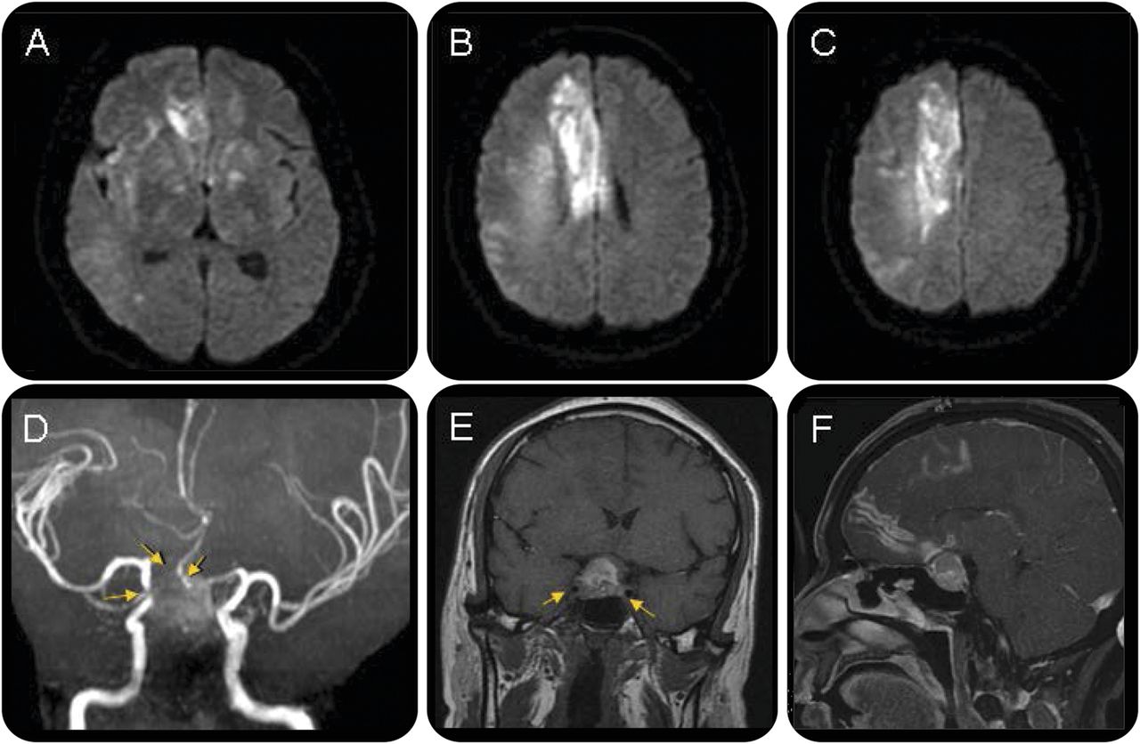 Diffusion-weighted图像揭示限制扩散双边大脑前动脉(ACA)和右大脑中动脉领土(a - c)。磁共振血管造影显示严重狭窄的远端颈内动脉(ICA)和穷人的可视化留住(D,箭头)。垂体macroadenoma部分hyperintense在t1影像(E),表明肿瘤内出血,增强的脑下垂体腺瘤瘤旁表面(F)。扩展到海绵窦导致双边intracavernous ICA的压缩,更糟糕的是在右边(E,箭头)。