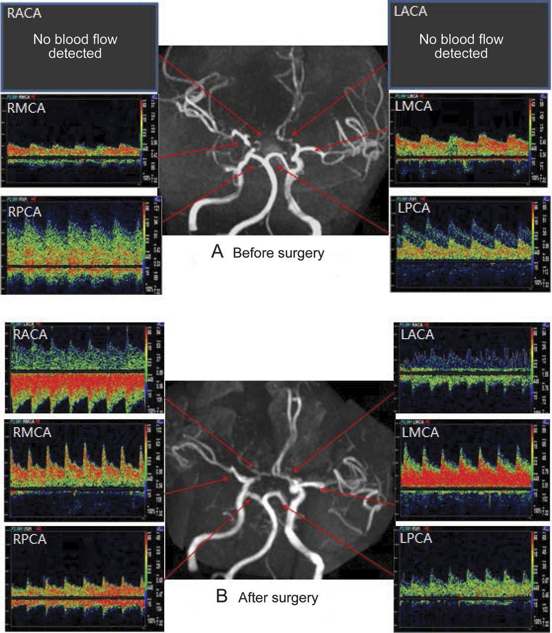 手术前(A)经颅多普勒超声显示严重缩小两国大脑中动脉和大脑前动脉,更糟糕的是在右边,在均值和最大流量速度,增加两国后脑动脉,这表明络脉的发展通过沟通后动脉。(B)的血流动脉外科手术之后变得正常。ACA =大脑前动脉;MCA =大脑中动脉;PCA =大脑后动脉。