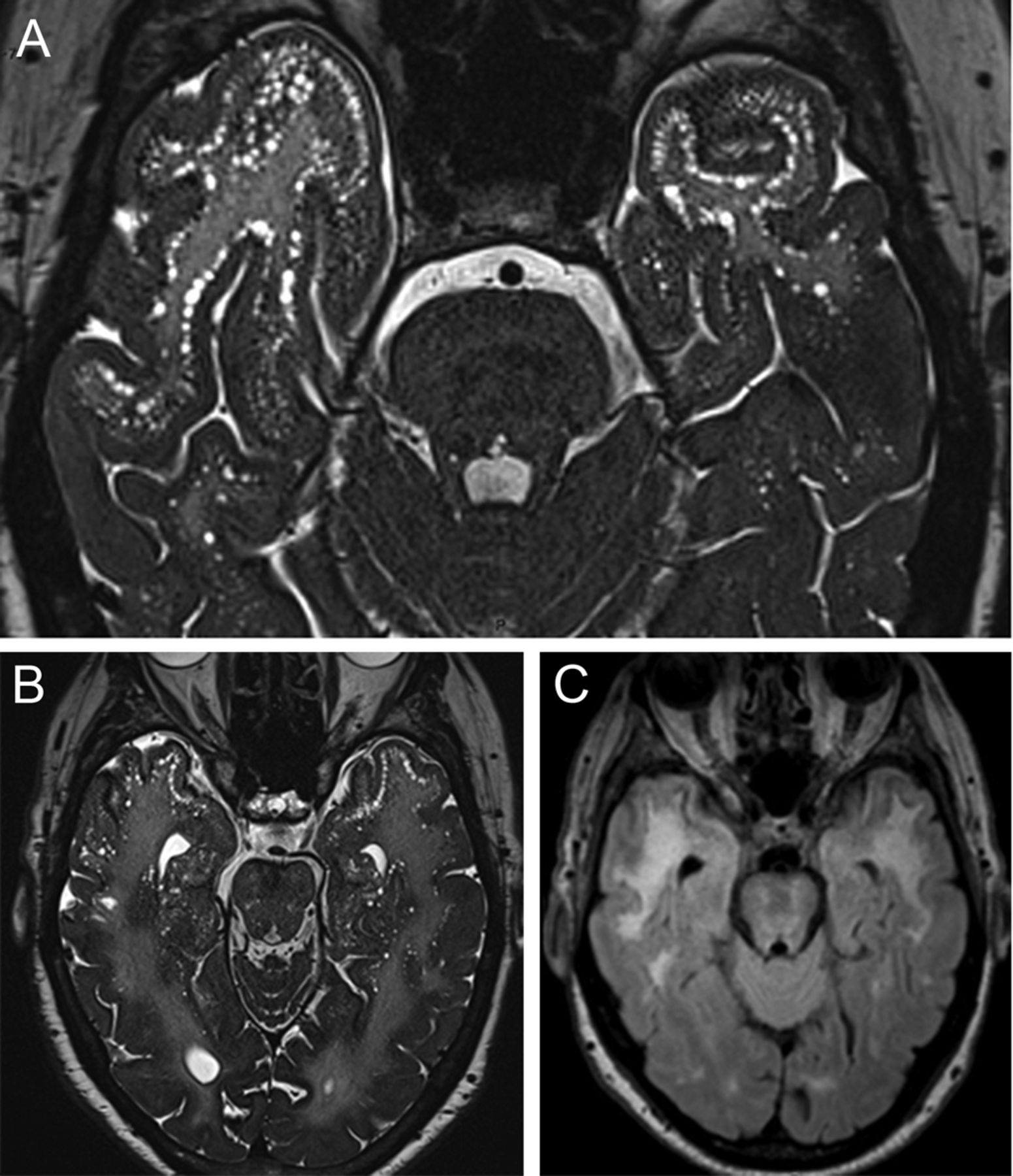 患者的脑部MRI脑常染色体显性遗传与皮层下梗死和脑白质病动脉病(CADASIL)显示hyperintense病变fluid-attenuated反转恢复(C)与众多颞叶皮层下血窦病变,最好以一个3 d空间序列(a, B)。