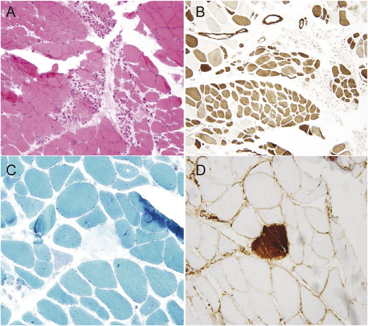 骨盆CT胸部或腹部/显示,没有证据表明恶性肿瘤,和他C-spine MRI显示严重宫颈狭窄C3与脊髓软化C6。肌电图是重复和报道显示神经源性和肌痛的过程。右肱二头肌活检进行外部设施。我们审查的肌肉活检幻灯片显示纤维类型分组,targetoid纤维,和核袋。还指出四散坏死和再生纤维和其他myophagocytosis坏死纤维,但小炎症。免疫染色显示沉积膜攻击复杂(MAC)坏死的肌肉纤维以及非坏死性肌肌纤维膜的纤维(图)。