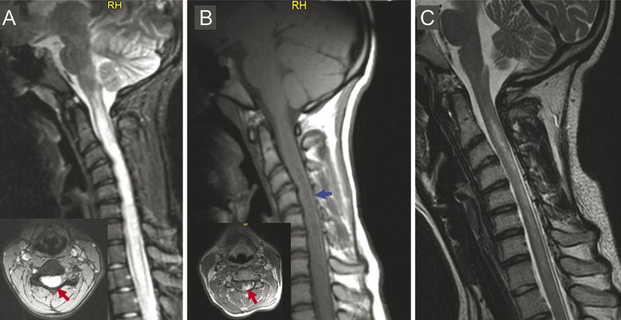 (A)矢状T2 fat-saturation颈绳MRI显示了一个广泛的(C2-T4级别)hyperintense病变包括几乎整个线截面(插入、红色箭头)。(B)矢状T1显示“肿绳”外观与中部地区hypointensity(蓝色箭头),可能反映了坏死,坏死被发现在患者的病理标本neuromyelitis视。增强在左侧横截面脊髓的钆注射后(插入、红色箭头)。(C)实质性决议T2-hyperintense病变的显示在后续救援血浆置换后矢状脑磁共振T2。