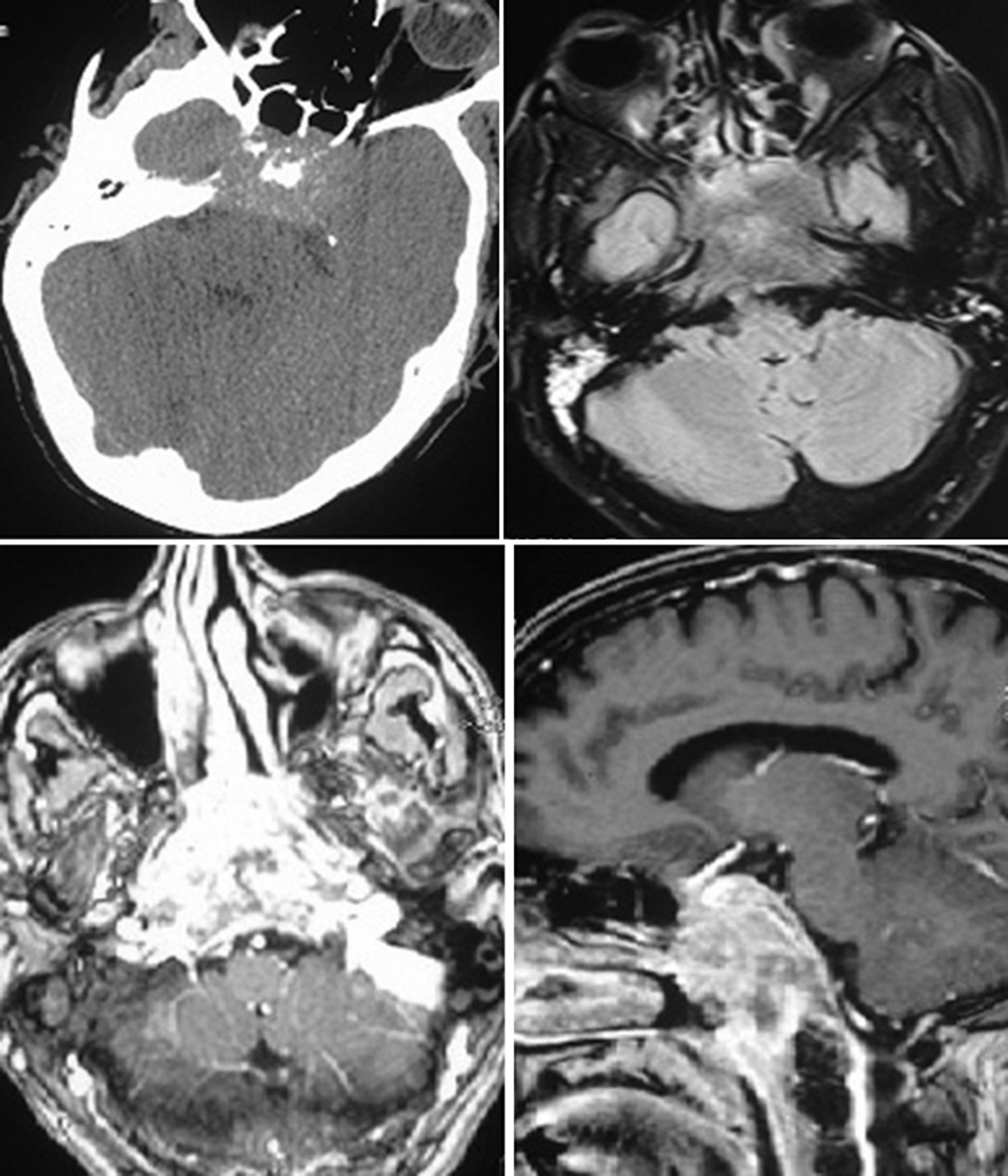 头部CT显示了一个不明确的温和hyperattenuating质量造成破坏的蝶骨包括鞍和斜坡。T2 fluid-attenuated反转恢复图像显示质量涉及蝶骨鞍和斜坡的破坏邻近结构进一步扩展。Postcontrast t1加权图像显示异构对比增强鼻咽癌质量与纵向扩展。