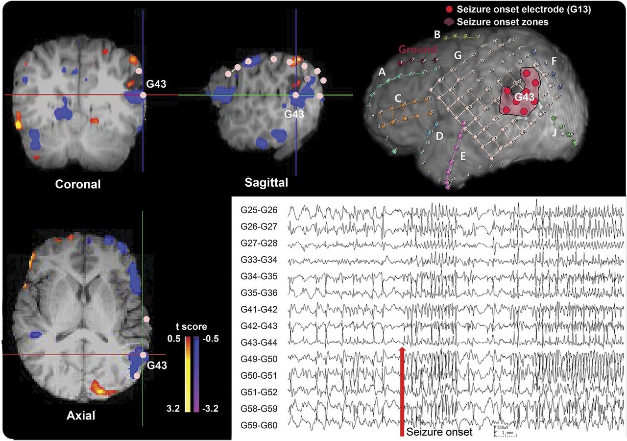 病人14 (表1)与右parietooccipital叶癫痫显示积极的价值观在国际刑事法庭内部−国米地图在正确的parietooccipital地区图片左边和顶部和底部中间上图。这与之很好匹配icEEG但他所示MRI三维表面呈现在右上角(标记为粉红色)和右下角icEEG发现(红色箭头标志着癫痫发作)。彩条右边的ICC地图表示t得分差异intrahemispheric——interhemispheric-ICC值。国际刑事法院的结果映射和icEEG病灶是正确的但他认为parietooccipital叶,这个病人已经控制发作自本地区的切除。ICC =内在连接的对比;icEEG =颅内脑电图;但他=癫痫发病区。
