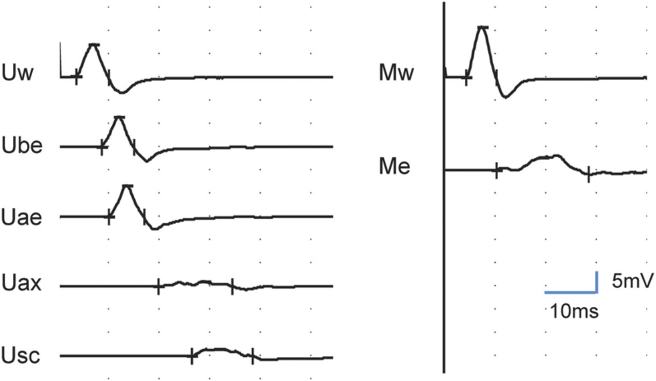 正中和尺侧运动传导阻滞分别刺激肘关节和腋窝。Ae =肘部以上;Ax =腋窝;在肘部以下;E =肘;M =中位数;Sc =锁骨上;U =尺骨;W =手腕。