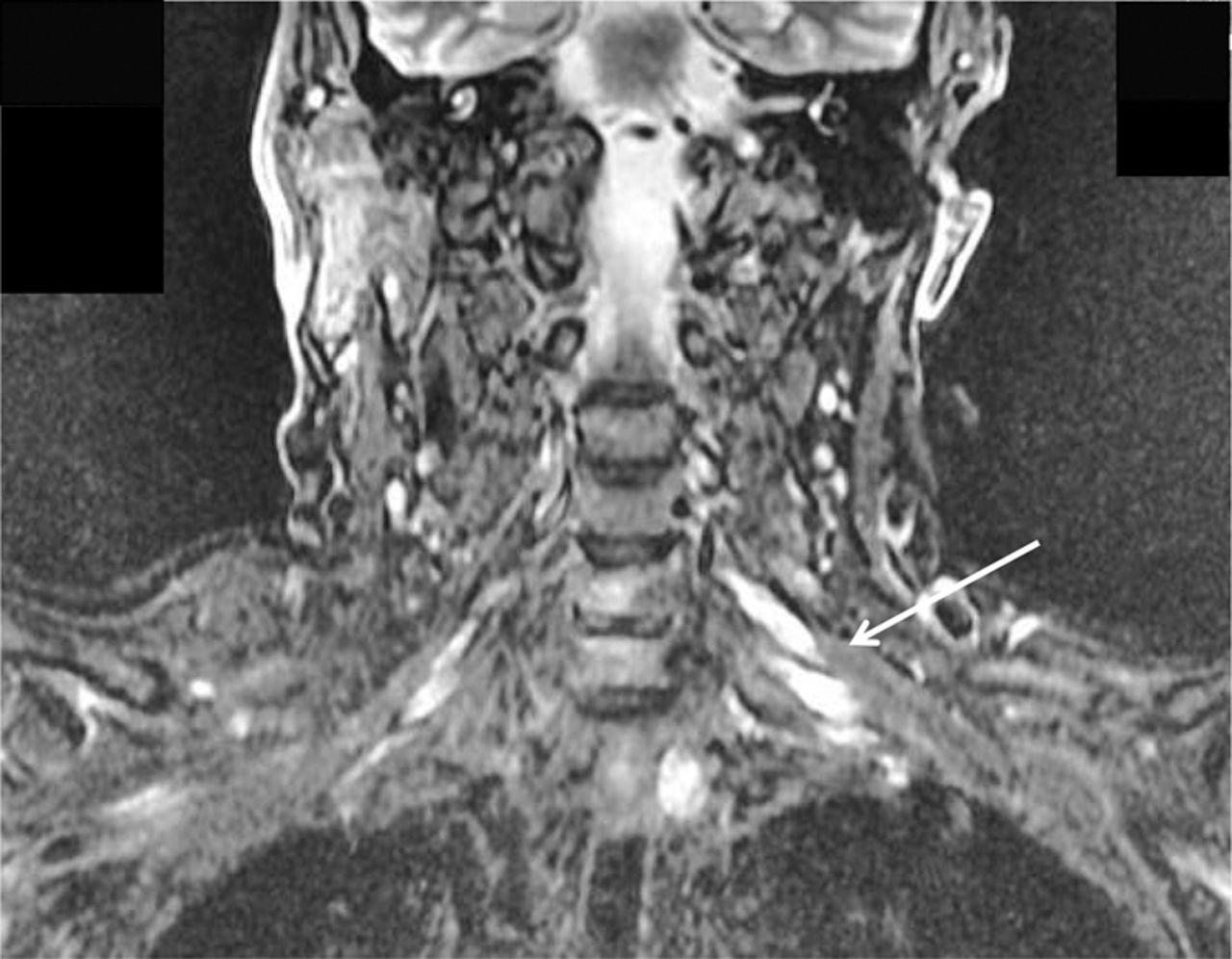 一位68岁的男子抱怨多年来左臂不协调、虚弱。临床检查显示假性震颤和轻微的左臂整体无力,袜子模式振动和针刺不敏感,只有轻微的左手本体感觉障碍首页®网址:首页Neurology.org).神经传导研究显示感觉电位普遍缺失或严重减弱,上肢多处运动传导阻滞(图1).MRI显示左臂丛神经根及干不对称扩大(图2).慢性炎性脱髓鞘性多神经根神经病可引起震颤,1但多灶性获得性脱髓鞘感觉和运动神经病,2不对称形式,尚未报道引起假手足徐动症。