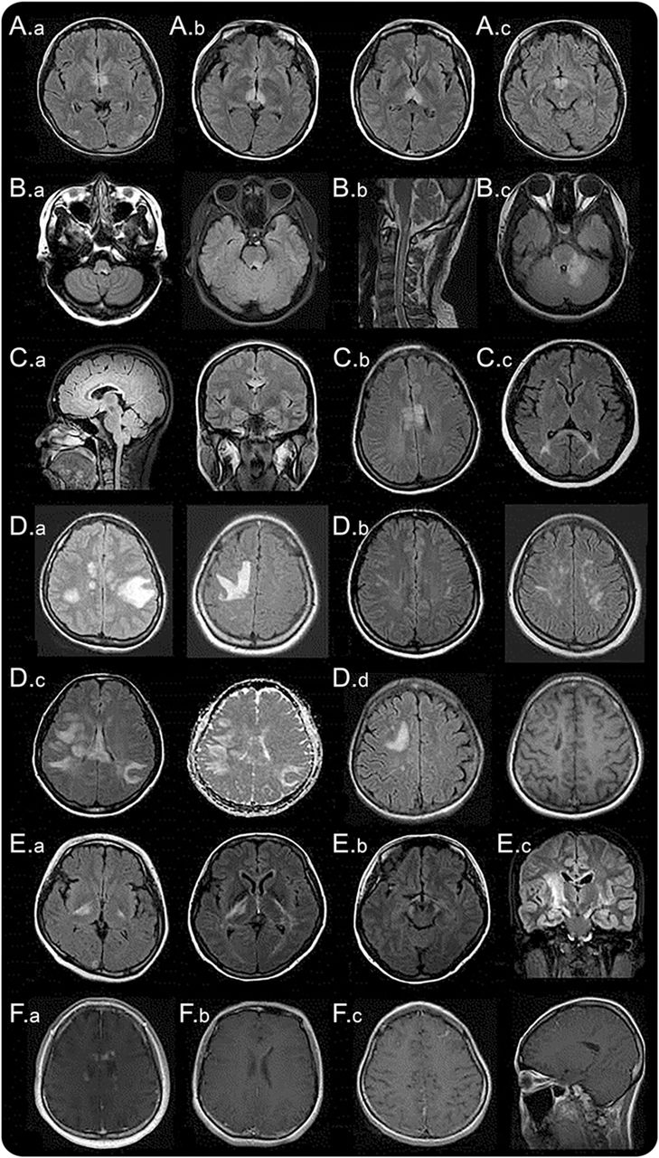 间脑的病变周围(一)第三脑室和脑导水管,(A.b),包括丘脑、下丘脑、中脑的前边缘(交流)。(本科)背脑干损伤邻近第四脑室,(反方向)线性髓病变与颈脊髓损伤,相邻(公元前)水肿和大量的背侧脑干病变涉及小脑脚。(一个)立即胼胝体病变侧脑室,室管膜衬后,(C.b)“大理石模式”胼胝体的病变,(运费到付)“拱桥模式”胼胝体的病变。块状半球白质病变,簇状(地方检察官)(D.b)长spindle-like或放射状病变白质束后,(特区)广泛和汇合的半球病变显示表观扩散系数地图上增加扩散系数表明vasogenic水肿,(d)在慢性阶段半球病变显示cystic-like腔的变化。(E.a)皮质脊髓束损伤涉及的内囊后肢和中脑(后代e.b.)大脑脚(欧共体)纵向锥体束后广泛的病变。(范围内)的云雾状增强(F.b)侧脑室的室管膜表面的线性增强,(F.c)脑膜增强。