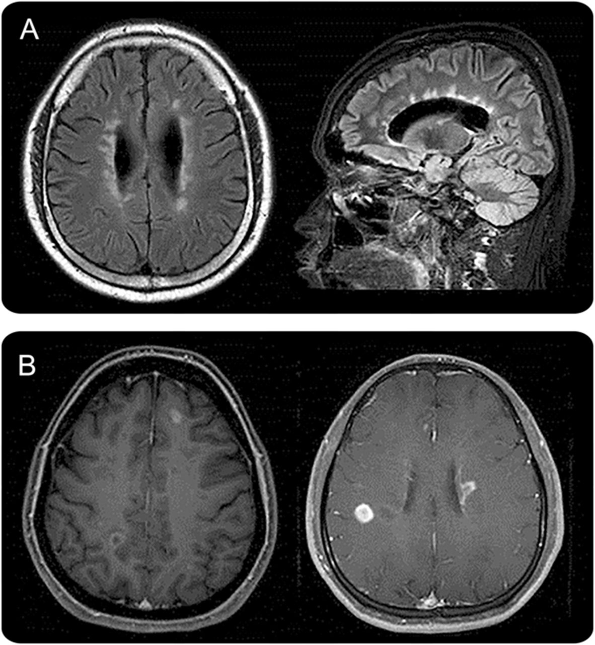 2006年动诊断标准包括一个大脑核磁共振nondiagnostic女士(使用徽章标准)在开始对动校正的支持。然而,现在知道MS-like病变可能出现在10%到12.5%的情况下,11,e35%到42%的患者动满足Barkhof标准。6,14,15,47最近的一份报告显示,13%和9%的患者NMOSD,分别会见了Barkhof和欧洲磁成像在MS诊断标准,对大脑核磁共振在发病。7损伤概率地图没有发现显著病变位置anti-AQP4抗体阳性的病人在那些女士。6然而,特点是在大脑MRI女士发现敏感的和具体的,如存在侧脑室和劣质的颞叶病变,道森手指,或一个s形U-fiber病变患者归为皮质病变成像敏感女士透露他们没有在动(不包括一个日本动病理学的研究48),而他们被认为在大多数患者MS。49,50特征脑损伤女士环绕中央小静脉高强度MRI > 80%。50,51在动损伤,这是不那么频繁,报道在9%到35%的情况下50,52和可能表明疾病的不同的致病机制。