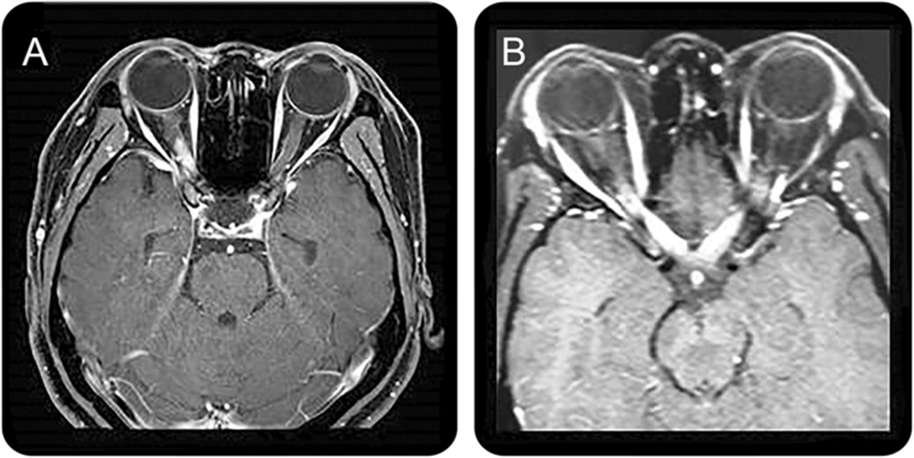核磁共振成像研究已经报道特异性的视神经鞘增厚,视神经hyperintensities t2加权序列和钆增强在t1序列在急性NMOSD。14,17然而,类似的结果也一直在中描述的女士,e22这些发现并不认为是NMOSD的诊断。最近的研究观察之间的微分视神经病变的MRI特征和NMOSD女士。32,33趋势更多的后参与视神经交叉等,同时两国疾病,一直在观察NMOSD (图3)。32,33因此,长段视神经的炎症,特别是当同时双边和后方延伸到视交叉,应该让我们怀疑NMOSD在适当的临床的诊断上下文。