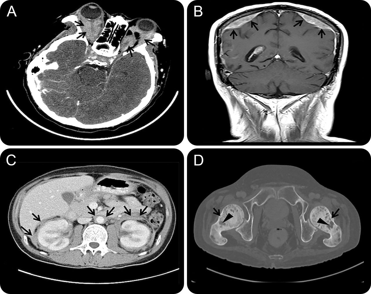 (一)软组织浸润在双边retro-orbital空间(箭头)。(B)的脑部MRI显示增强pachymeninges(箭头)。(C)腹部CT显示装箱的双边肾脏和主动脉浸润(箭头)。(D)盆腔CT显示混合溶骨的(箭头)和osteosclerotic(箭头)股正面的病变。