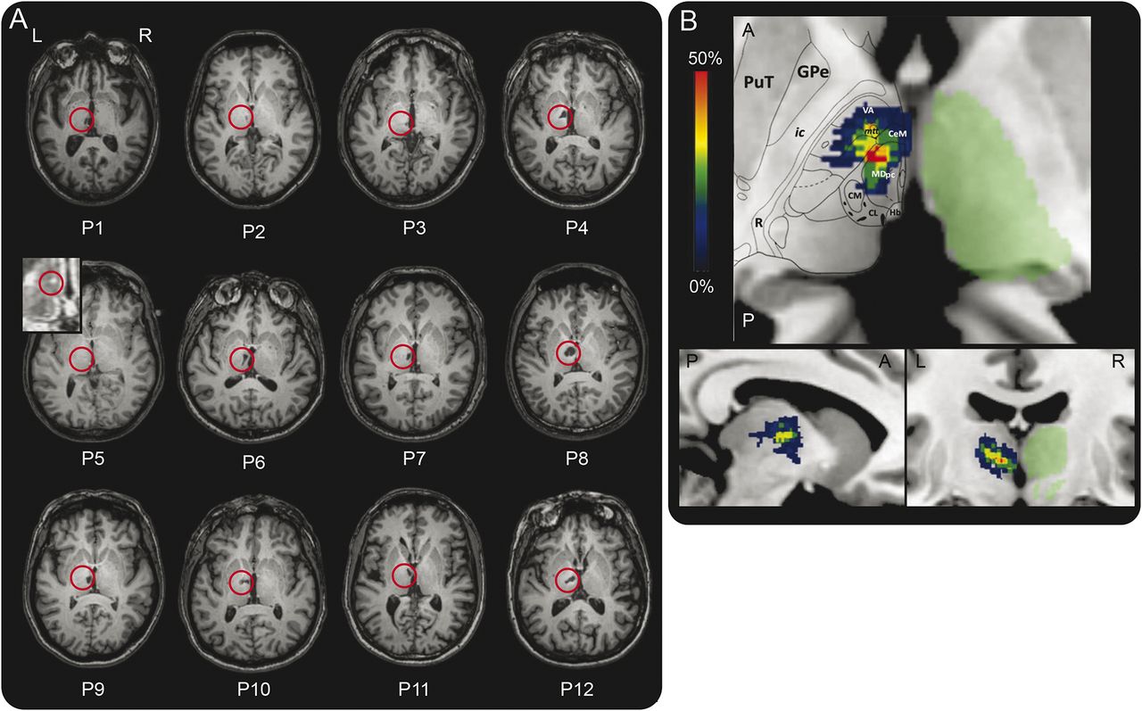 (A) T1的轴向部分病人的MRI。红圈显示梗塞。P5病变几乎不可见的形象(病灶体积= 5毫米3)。因此,我们提供一个变焦fluid-attenuated反转恢复序列上的病变。(B)重叠的病变患者(%的患者,n = 12)在一个轴向视图(最高;=前,P =后),矢状视图(左下角;=前,P =后)和冠状视图(右下角)。面具的丘脑(绿色)获得使用第一个工具在目前提供的信息。一片覆盖着莫雷尔地图集有结构感兴趣的轴向视图。杰姆=中央内侧;CL =中央外侧;厘米= centromedian; GPe = external globus pallidus; Hb = habenula; ic = internal capsule; MDpc = parvocellular part of the mediodorsal nucleus; mtt = mammillothalamic tract; PuT = putamen; R = reticular nucleus; VA = ventral-anterior.