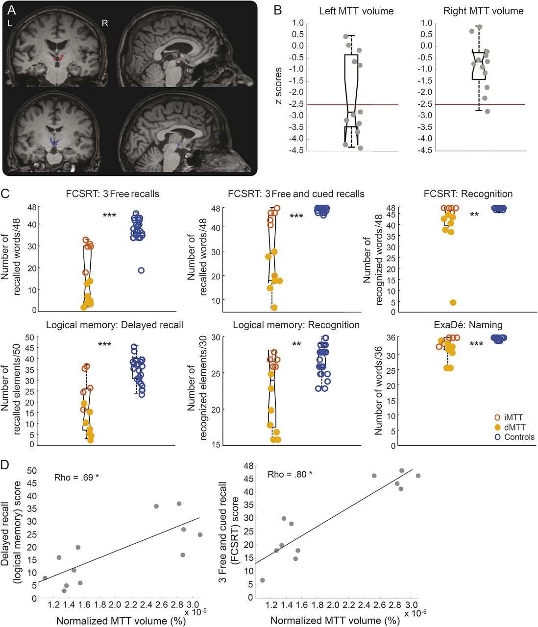 (一)插图mammillothalamic大片(MTTs)患者和控制。分割的左派和右派MTTs本地病人的大脑(红色),和一个控制(底,蓝色)。(B)患者MTTs卷。左派和右派体积分布在患者(z分数)。(C)记忆力和语言表现组(病人与对照组)和子组(损坏MTT子群(dMTT)对肝癌和完整的子群[iMTT])。组间比较的病人和控制。* *p< 0.01。* * *p< 0.001。蓝色的圆圈代表控制,空的橘色圆圈表示iMTT病人,填充橙色圈代表dMTT病人。(D) MTT体积和内存性能。非文字记忆性能之间的相关性(这里使用逻辑内存测试评估和自由和暗示选择性提醒测试[FCSRT])和麻省理工。*p< 0.05,2-tailed。