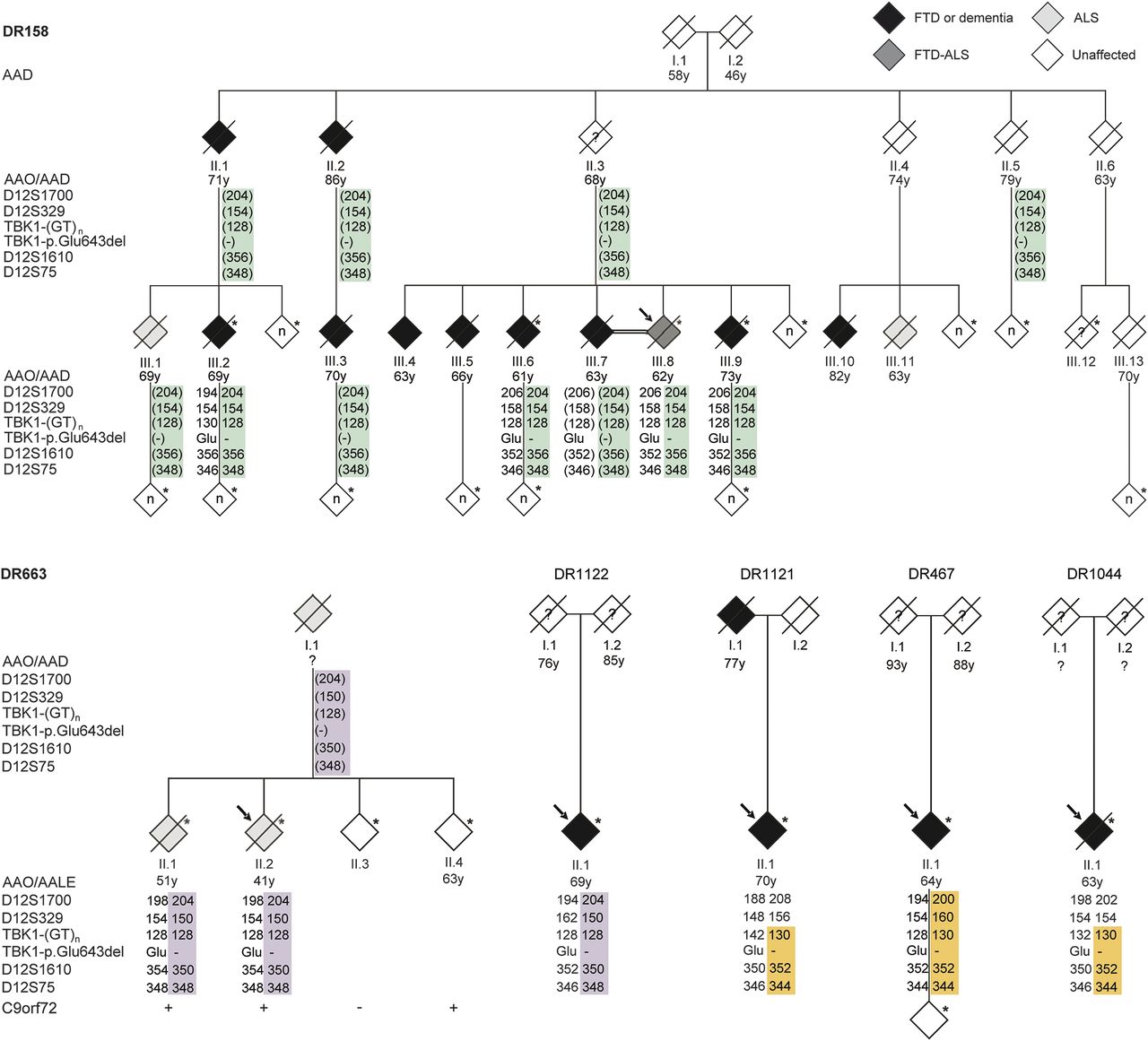保护参与者的隐私,我们掩盖了每个人的性别,炒家庭DR158的血统,不指定数量的个体测试所示白色钻石。该指数病人用箭头指示。填充符号代表患者,发病年龄(氧化铝)年低于他们的象征。死亡年龄(AAD)显示个人死于老年无症状。在家庭DR663 3的4个孩子也带着重复扩张的突变C9orf722影响(张和II-2)和1无症状(与),对他们来说,年龄最后考试(AALE)。星号标识的家庭成员来说,基因组DNA。Glu643del突变是显示为“-。“5多态标记,包括TBK1——(GT)n重复多态性位于上游400 kbTBK1显示在左边和侧面TBK1突变p。Glu643del at both sites. Genotypes of additional polymorphic markers can be found in table e-3. The 3 different disease haplotypes are shown with colored bars: green haplotype of at least 7.5 Mb, purple haplotype of at least 8.7 Mb, and orange haplotype of at least 3.0 Mb. Haplotypes based on segregation data are indicated in regular font, those based on allele sharing are in italics, and those that were inferred are between brackets. ALS = amyotrophic lateral sclerosis; FTD = frontotemporal dementia.
