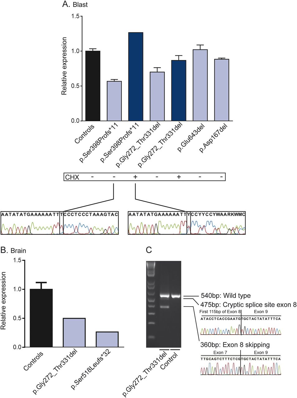 定量PCR的量化TBK1记录从淋巴母细胞细胞(A)和额叶皮质(B)的LOF突变携带者(蓝色酒吧)相比,控制人没有突变(黑条)归一化不同的看家基因。5 p无关。Glu643del mutation carriers were included. Error bars represent the SD. Below the chart is indicated if cells were treated (+, dark blue bars) or not treated (−, light blue bars) with cycloheximide (CHX), a protein synthesis inhibitor. Sequence traces are obtained by real-time PCR from the lymphoblast cells of the p.Ser398Profs*11 mutation carrier treated or not treated with CHX using primers in exon 6 and exon 21. (C) Real-time PCR with primers in exon 6 and 10 of cDNA of brain of the p.Gly272_Thr331del mutation carriers is shown on agarose gel, with the respective sequence traces from the aberrant transcripts.