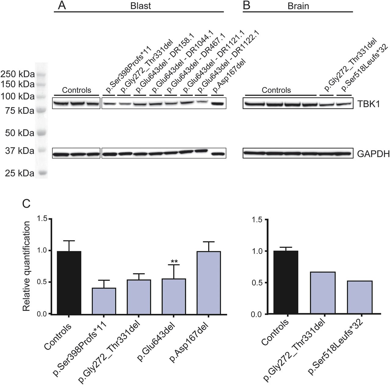 免疫印迹分析蛋白质提取物淋巴母细胞细胞(A)和额叶皮质(B)的功能丧失(LOF)突变携带者而控制人没有突变。的p。Glu643del mutation, 5 unrelated index patients were included. The upper band represents TBK1 (84 kDa) and the lower band the housekeeping protein GAPDH (37 kDa). The graphs below (C) show the quantification in control samples (black) and patient samples (blue) of the TBK1 signal normalized to the signal of GAPDH. Error bars represent the SD; ** indicates a significantp值< 0.01相比,控制。