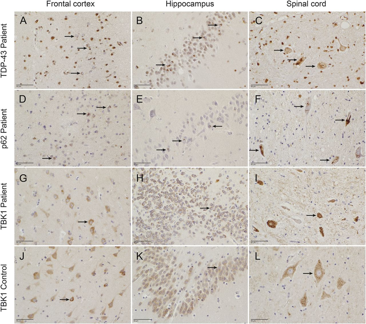 免疫组织化学的额叶皮质(A、D、G)和海马(B、E、H) 1额颞叶大叶性变性患者p。Gly272_Thr331del突变(DR189)和脊髓(C、F I)的肌萎缩性脊髓侧索硬化(ALS)患者p。Ser518Leufs * 32突变(DR1124)相比,控制个人没有突变(J-L)。额颞叶痴呆病人DR189,轻微的额叶皮层的神经元损失和在较小程度上颞皮层和海马。适量TDP-43和p62神经元胞质内含物(NCI)(箭头)和神经突短无营养的,但没有intraneuronal核内包涵体,被发现在所有层的额(A, D)和颞neocortices,海马齿状回的(B, E),海马旁transentorhinal皮层,neostriatum,小脑和螺旋体,但不是。在ALS患者DR1124,没有明确的皮质异常在场,但病理上下运动神经元疾病的迹象还不明显。严重的髓鞘脱失锥体束的中脑、脑桥、延髓,和整个脊髓和严重舌下神经核神经元损失,以及颈椎和胸椎脊髓腹角,被观察到。TDP-43-positive (C)和p62-positive (F) NCI主要是局限于舌下神经核和腹侧角神经元的宫颈癌和thoraco-lumbar脊髓(箭头)。细胞质TBK1免疫反应性(箭头)皮质神经元的额叶皮质(G, J),海马齿状回的(H, K),颈和腹侧角神经元(我,L)病人和对照组没有差异。TBK1 TDP-43-positive杂质没有染色。