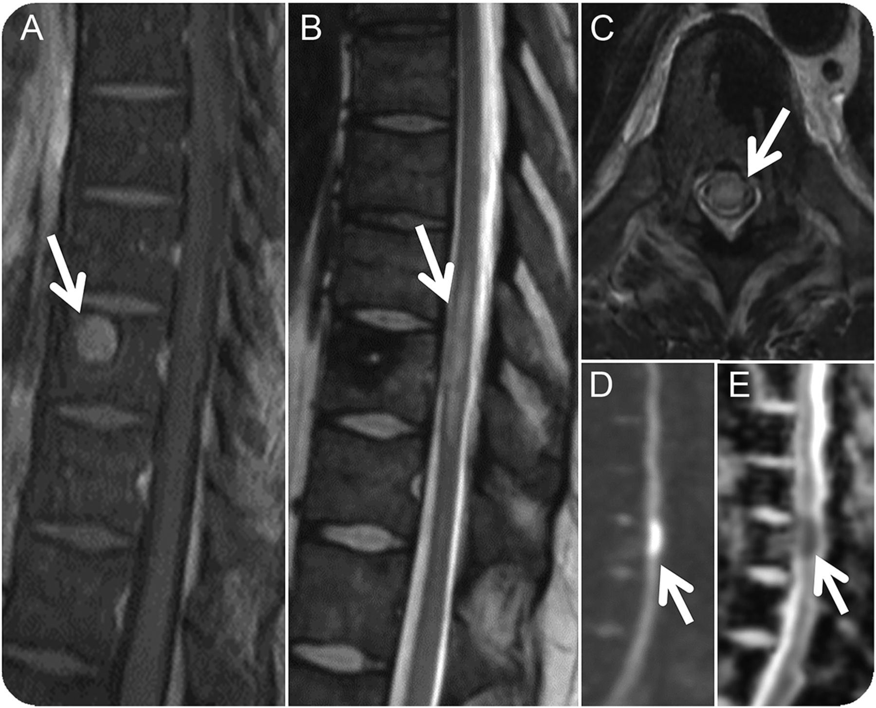 (A)预处理矢状postgadolinium t1加权图像展示一个增强T10椎体病变(箭头所指)。在t2加权像(中)立即治疗后矢状和轴向,diffusion-weighted形象,表观扩散系数地图展示水肿的绳(箭头,B和C),限制扩散(箭头,D和E)指示细胞毒性水肿。