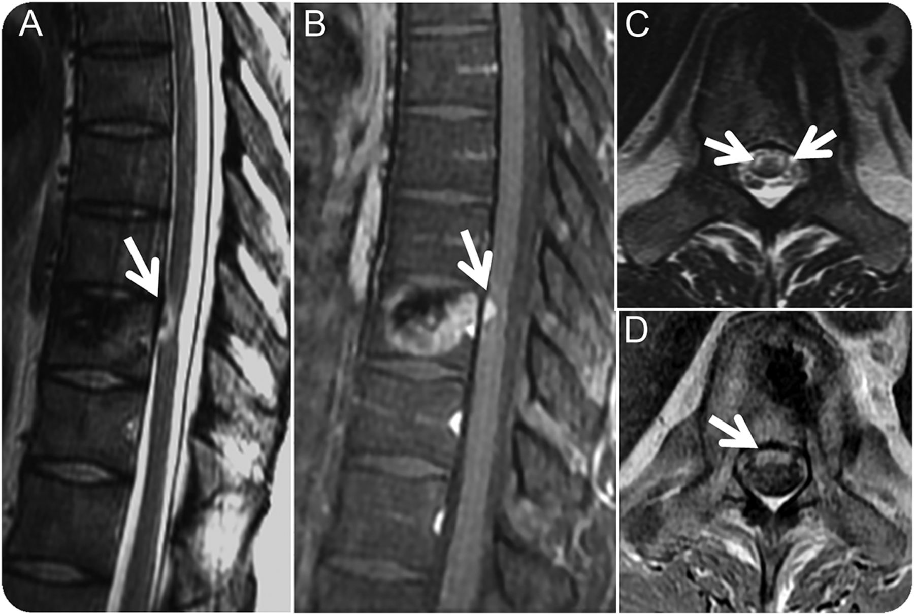(安妮)三个月治疗后矢状T2 postgadolinium t1影像和轴向T2 postgadolinium t1影像:T2 hyperintensity和增强在腹侧胸线的水平消融(箭头,罪犯)。绳拴在硬脑膜出现罕见由于疤痕(箭头,A)。