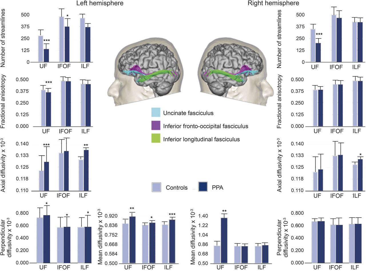 tract-specific测量差异的钩状的纤维束(超滤),劣质fronto-occipital纤维束(IFOF),伪劣纵束董继玲女士之间的控制和原发性进行性失语患者(PPA)。测量数量的流线,分数各向异性扩散系数,轴向扩散系数和垂直扩散系数报告感兴趣的大片。统计上显著的差异控制和患者在每个束与星号(*表示p< 0.05;* *p< 0.01;* * *p< 0.001;意义Bonferroni阈值= 0.0016)。