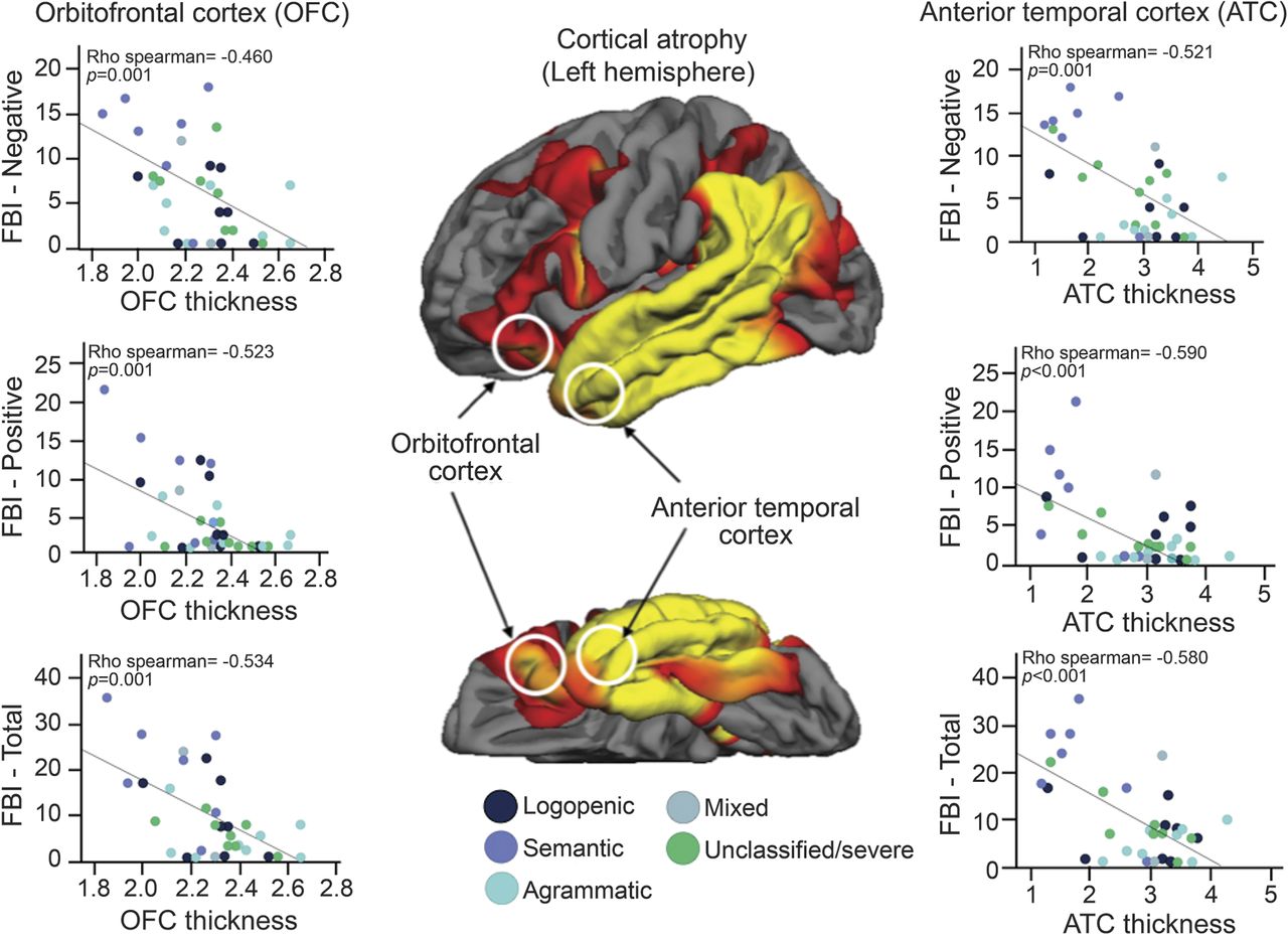 整个大脑分析显示显著的左颞顶部和额叶皮质萎缩PPA与控制(图2)。ROI方法证实,与健康对照组相比,PPA患者显示左(大幅萎缩p< 0.001,t[57]= 4.367)和右(p= 0.014,t[57]= 2.537)眼窝前额皮质和在左边(p= 0.001,t[57]= 3.391)和右(p= 0.004,t[57]= 2.996)前颞叶。皮质厚度的roi左眶额和前颞叶皮层与负分数呈负相关(斯皮尔曼=−0.460,p= 0.001和斯皮尔曼=−0.521,p分别为= 0.001),正面的分数(斯皮尔曼=−0.523,p= 0.001和斯皮尔曼=−0.590,p分别为< 0.001),总分在联邦调查局(斯皮尔曼=−0.534,p= 0.001和斯皮尔曼=−0.580,p分别为< 0.001)(图2)。正确的前颞叶和成绩之间的相关性在联邦调查局不显著(表依照)。