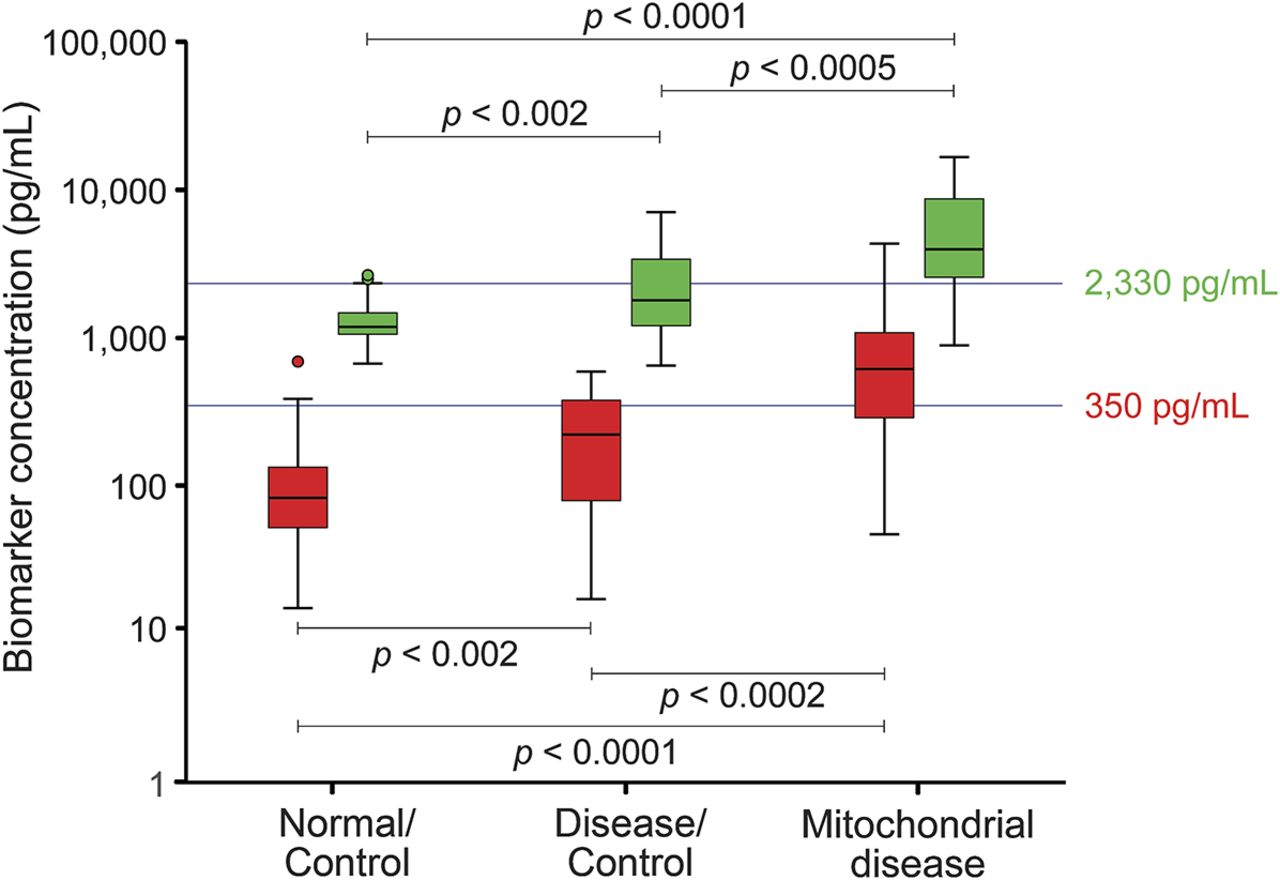 血清FGF-21(红色)和GDF-15(绿色)浓度对这三组实验显示在对数刻度。相同的组中位数浓度之间的关系对于生物标志物可以看出,高水平的线粒体疾病组相比,疾病控制和控制。生物标志物浓度使用非参数Mann-Whitney实验组之间比较U测试。第95个百分位阈值达标(确定的对照组生物标志物浓度)所示蓝色横线的350 pg / mL为GDF-15 FGF-21和2330 pg / mL。