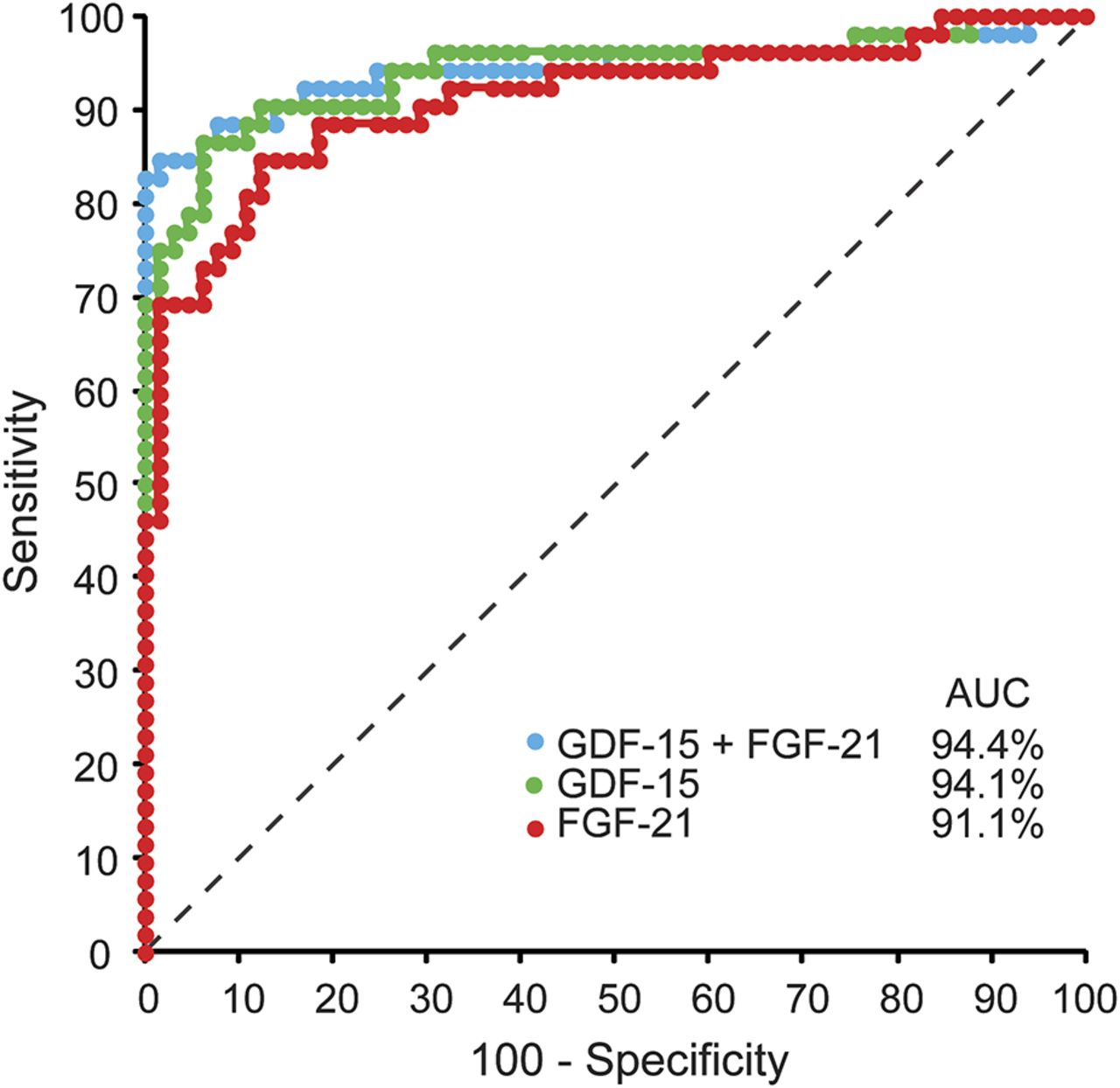 有疾病的可能性如果FGF-21水平是高于阈值截止350 pg / mL,称为诊断,或者被计算在我们之前的研究中是45.7 (95% CI 12.5 - -166.5,p< 0.0001)。2在这项研究中,GDF-15诊断或计算是73.5 (95% CI 19.6 - -276.3,p< 0.0001)。进一步,ROC曲线分析FGF-21和GDF-15 GDF-15稍微更好(AUC 0.941 (95% CI 0.893 - -0.989))比FGF-21 (AUC 0.911 (95% CI 0.855 - -0.968))在组合预测疾病的敏感性和特异性,尽管AUC并没有统计上的不同。结合这两种生物标志物没有增加AUC显著(0.944 (95% CI 0.895 - -0.994))在单独GDF-15,表明几乎没有一起协同诊断当考虑生物标记中获益。