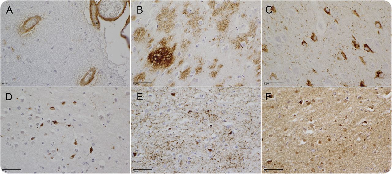 DR170.1有大量的老年斑(SP)在皮层和小脑皮质的分子层,与零星的SP中脑、脑桥网状结构。DR73,大量SP的皮层和小脑皮层在较小程度上,中脑、脑桥在场。DR1092,最大的扩散和经典SP发现扣带回,额回,颞回优越,海马体,和区域striata,而SP在小脑皮质分子层和网状结构的数量更少。DR1229有严重Aβ免疫反应性与扩散和皮层神经炎的SP,小脑、中脑、脑桥网状结构。有严重的淀粉样血管病DR73 DR1229, DR1092和(在较小程度上,但在DR170.1缺席。