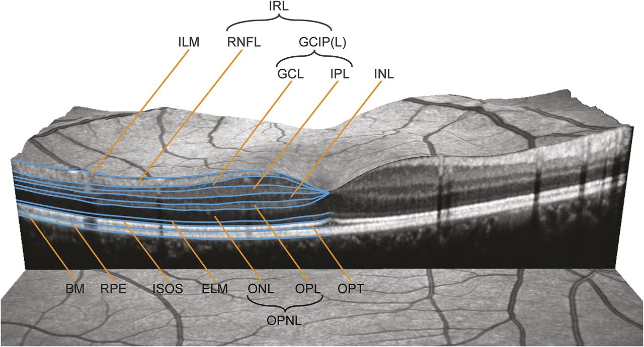 不同的层(这些)的边界中指定表2说明在一个中央垂直扫描孔穴的中间。BM =布鲁赫膜;榆树=外部限制膜;GCIP (L) =神经节细胞和内网状层;GCL =神经节细胞层;ILM =内部限制膜;INL =内部核层;IPL =内网状层;IRL =内视网膜层;ISOS =内外段; ONL = outer nuclear layer; OPNL = outer plexiform and nuclear layer; OPL = outer plexiform layer; OPT = outer photoreceptor tips; RNFL = retinal nerve fiber layer; RPE = retinal pigment epithelium.