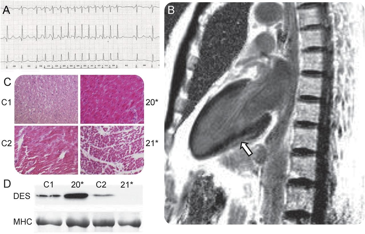 (一)24小时心电图显示nonsustained心房心动过速(病人4 b)。(B)心脏MRI 11 B演示subepicardial纤维化(箭头所指)。(C)心肌的苏木精和伊红染色控制(C1和C2)和HMERF患者(20 * 21 *)。(D)对肌间线蛋白免疫印迹染色(DES)和肌球蛋白重链(MHC)。