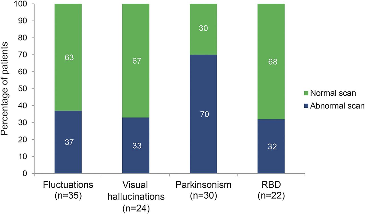 路易体痴呆的存在特征的结果123年I-FP-CIT扫描所示图1。帕金森患者更多的特性有一个异常扫描(70%)和其他特性相比,在32% - -37%异常扫描(p= 0.001)。