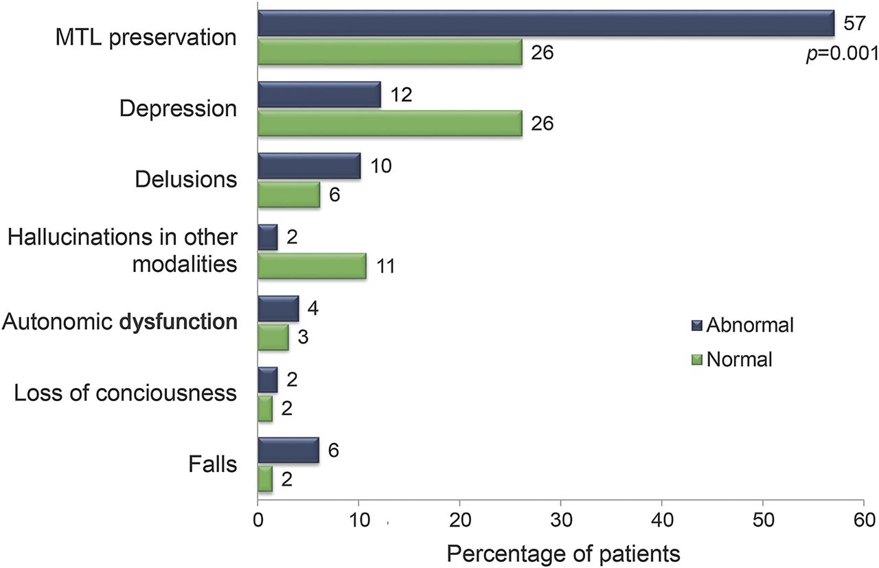患者的异常扫描,更多的患者保留内侧颞叶(MTL) (57%;p= 0.001;Fisher精确检验),下文的支持功能,患者正常扫描相比,只有26%的人保留MTL (图2)。没有显著差异的其他支持功能异常患者123年I-FP-CIT扫描。
