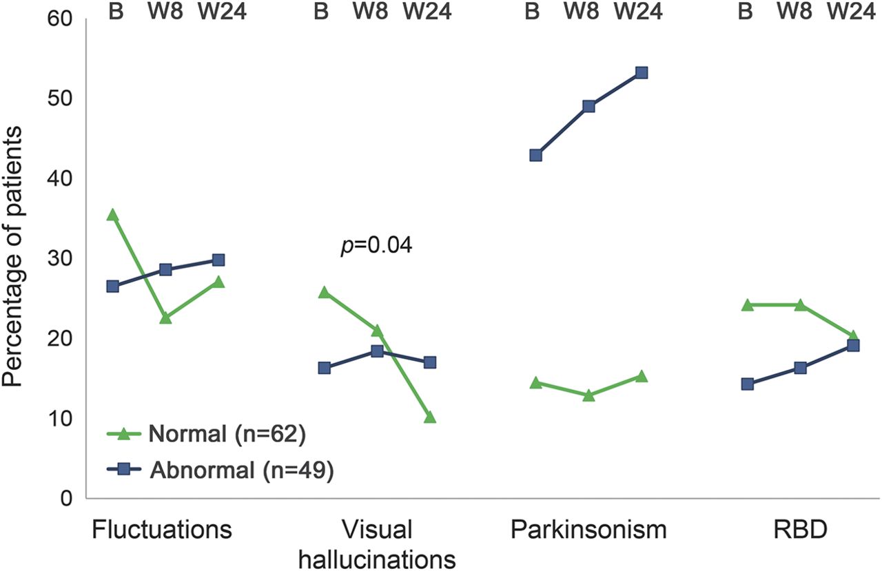 在参与者不正常扫描,所有功能的频率保持稳定的超过6个月,除了帕金森症,而增加,尽管这没有达到统计学意义(图3)。然而,有一个显著增加UPDRS评分在24周(p< 0.01)相比,异常患者的基线扫描。参与者下文的频率特性与正常扫描没有改变随着时间的推移,除了视觉上的幻觉,从26%下降到10% (p= 0.04)。在基线幻觉的患者,两组之间没有差别异常和正常的扫描的起始或增加药物在随访中(胆碱酯酶抑制剂、美金刚胺或抗精神病)。异常组中,6/8的患者开始胆碱酯酶抑制剂或增加剂量。在正常组,8/14正常扫描患者开始胆碱酯酶抑制剂(n = 5)或美金刚胺(n = 3)或增加剂量。没有开始在两组患者抗精神病药物或剂量的增加。