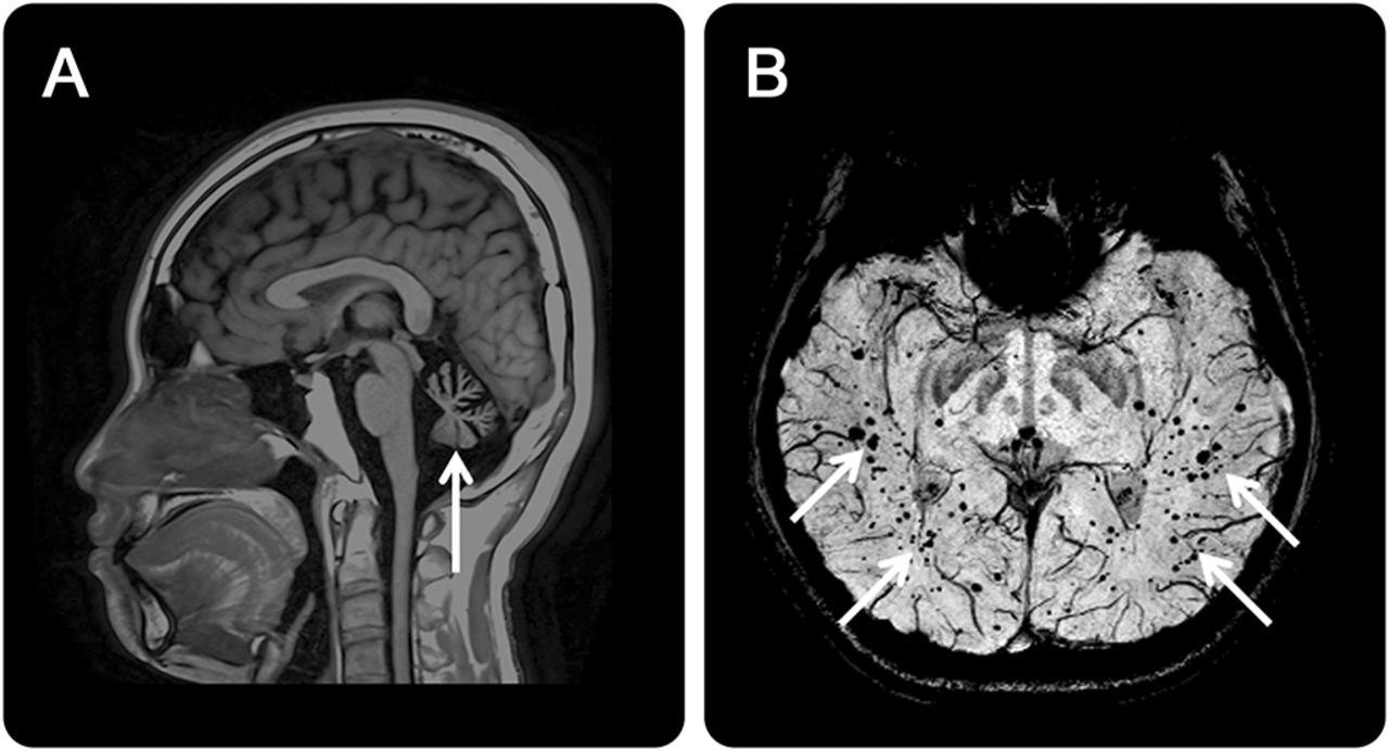 (一)t1加权磁共振成像显示小脑萎缩(箭头所指)。(B) Susceptibility-weighted图像(瑞士)显示点状的信号空间散射在正常大脑(箭头),表明microbleeds含铁血黄素沉积,有相关的扩张血管ataxia-telangiectasia患者中。