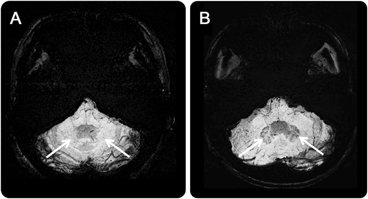 (A) Susceptibility-weighted图像(瑞士)揭示铁的缺乏hypointensity信号齿状核的病人ataxia-telangiectasia(箭头)相比,一个年龄和sex-matched正常控制参与者(B),而齿状核信号与一个典型的黑铁相关存款是明显可见的瑞士(箭头)。