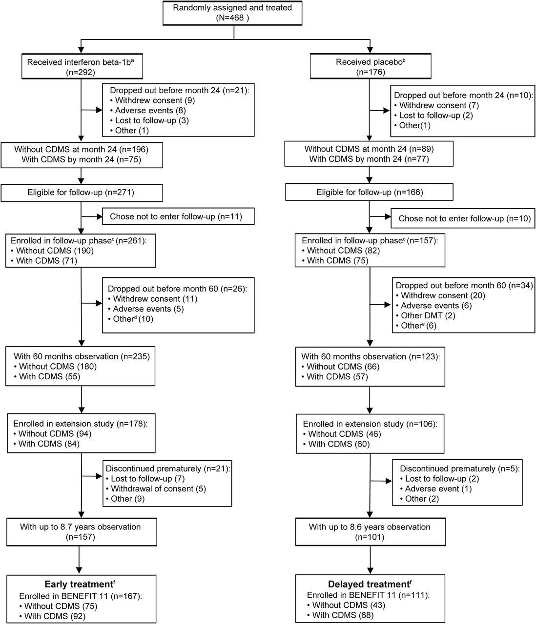 一个包括一个病人随机分配接受干扰素beta-1b但与安慰剂治疗。b包括一个病人随机分配接受安慰剂,但干扰素beta-1b对待。c包括一个病人进入效益过早停药后随访研究效益研究。d四失访2缺失的数据,1不服从,最后1治疗失败,2拒绝访问。e三失访1搬迁离开网站,怀孕,1因为工作无法参加访问。f有资格获得11年随访,患者只需要随机和治疗在原始的好处(即学习。,他们不需要包括在以前的效益分析)。好处=倍泰龙/ Betaseron新兴女士首次治疗;CDMS =临床明确多发性硬化症;DMT =疾病修饰治疗。