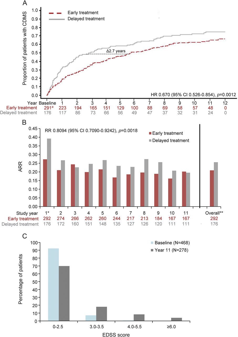 方法:参与者受益(倍泰龙/ Betaseron在首次治疗)新兴女士被随机分配接受干扰素beta-1b(早期治疗)或安慰剂(延迟治疗)。后转换为临床明确多发性硬化症(CDMS)或2年,患者安慰剂可以切换到干扰素beta-1b或其他治疗。十一年随机化后,患者重新评估。